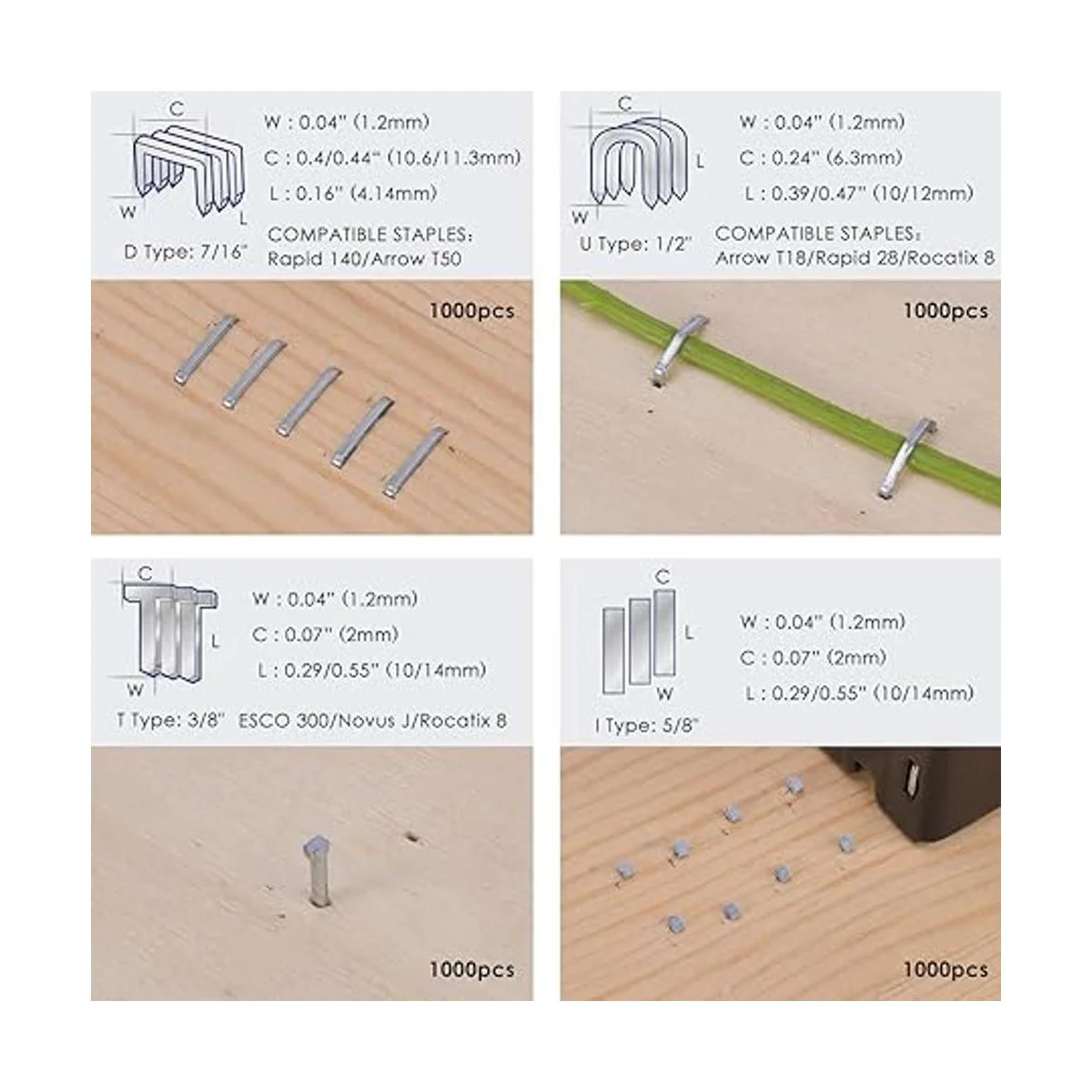 Herramienta de fijación versátil: la de grapas 4 en 1 de YEAHOME acepta grapas en forma de D, en forma de U, en forma de T y en forma de pin. Este kit viene con 1000 clavos de cada tipo D, tipo T, tipo U y pines para una amplia variedad de aplicaciones: reparaciones generales de bricolaje, manualidades, decoración, proyectos de tapicería, techos, y mucho más.