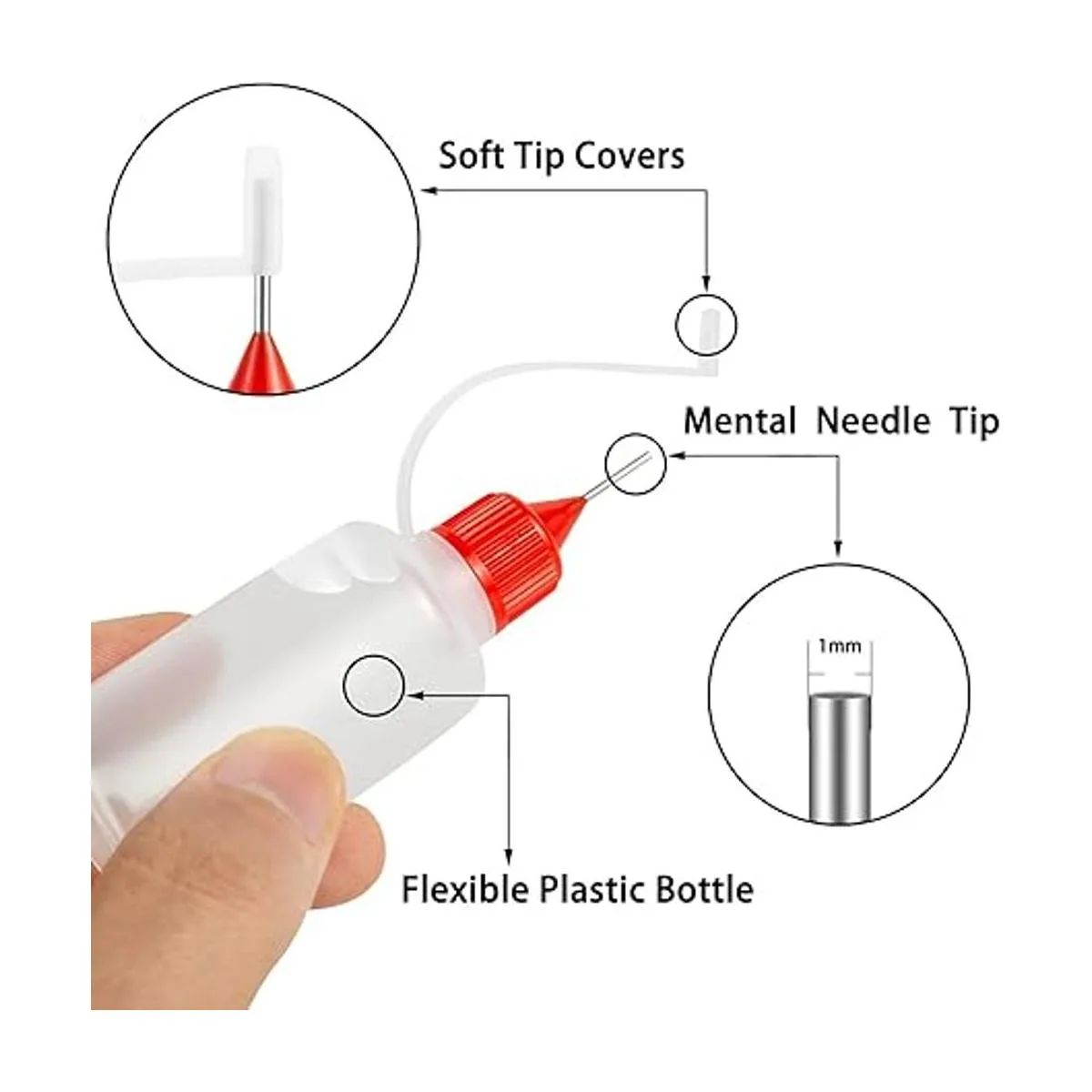 Material: nuestras botellas de pegamento con punta de aguja están hechas de plástico suave y flexible, se aprietan fácilmente. Las puntas de preisión están hechas de metal inoxidable, es reutilizable y duradero. Los bucles de silicona cubren bien la punta y evitan que el líquido se seque o se escape.