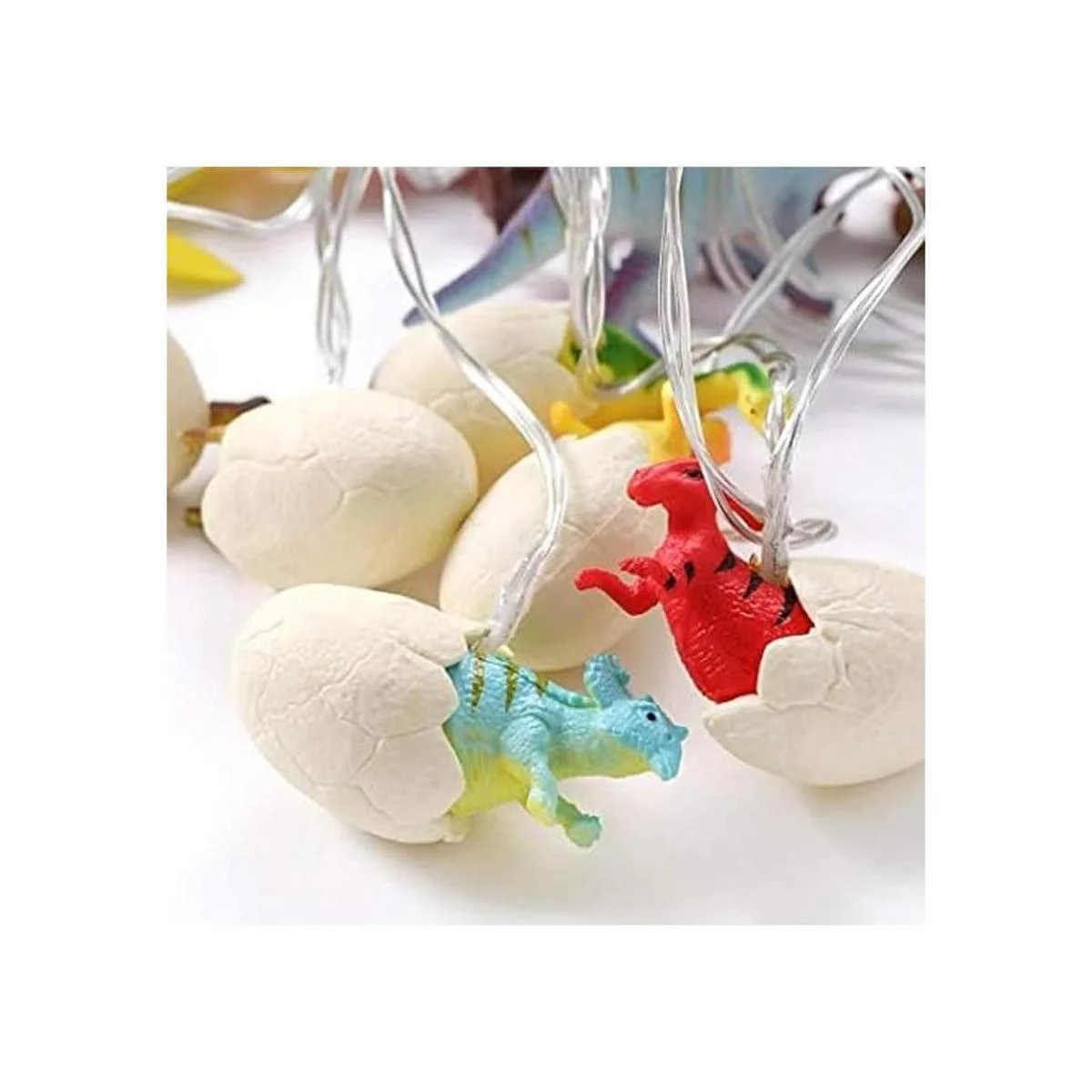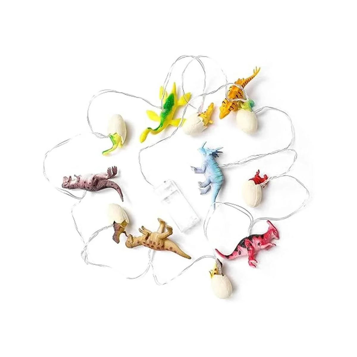 La cadena de luces de dinosaurio con huevos brillantes contiene seis colores diferentes de dinosaurio luminoso y seis estilos diferentes de huevos de dinosaurio