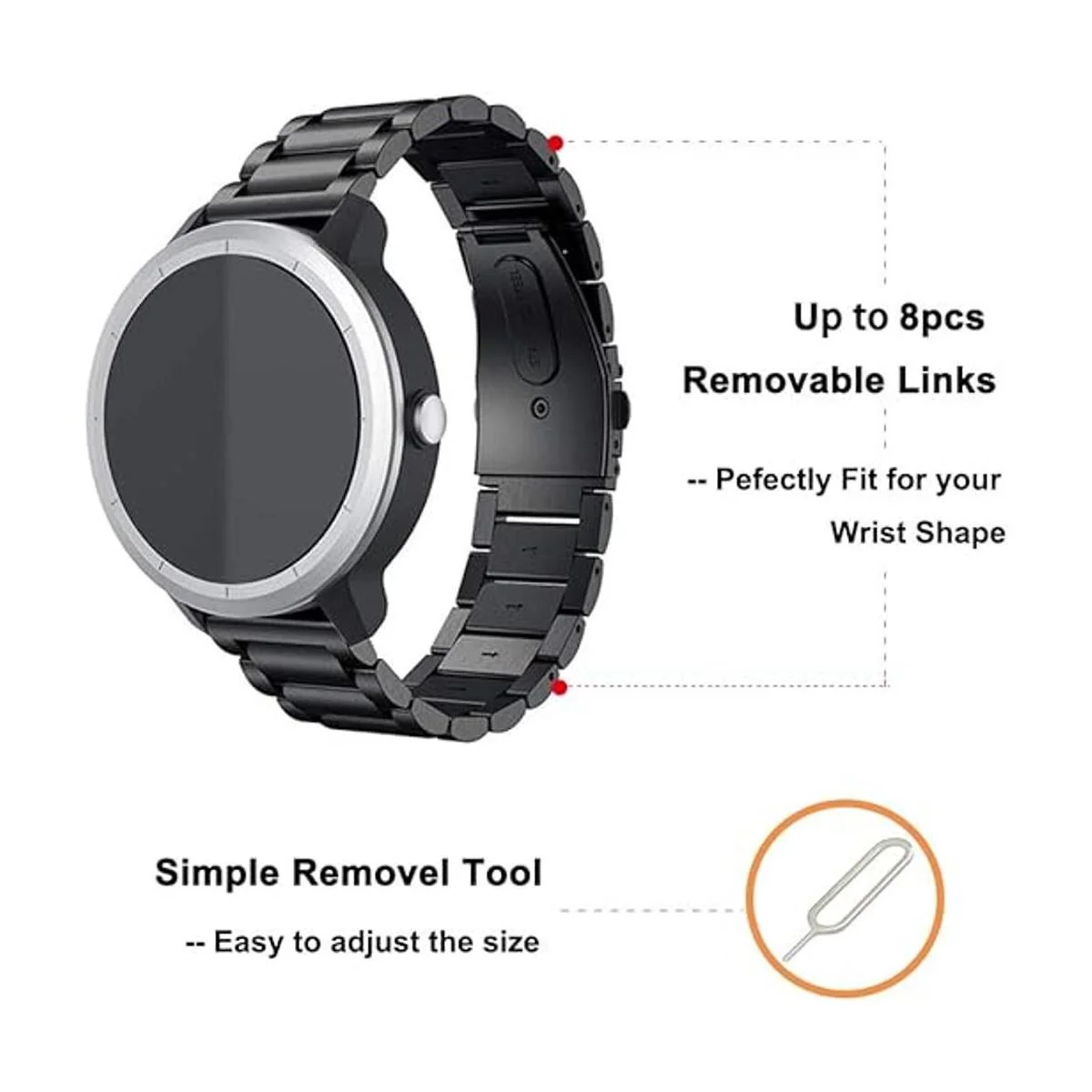 El diseño de 1/2 eslabones de la correa de reloj de metal ayuda a que se ajuste perfectamente a la forma de tu muñeca