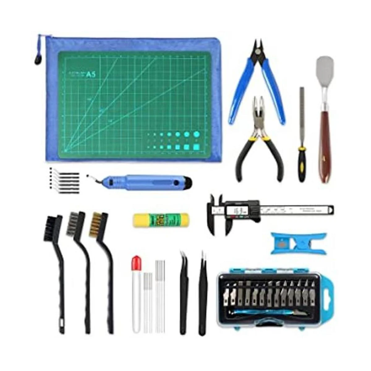 Juego de 45 piezas: el producto incluye 1 juego de herramientas de desbarbado 1 mango de herramienta de desbarbado NB1100 y 6 cuchillas de desbarbado, calibrador digital electrónico, 10 agujas de limpieza, juego de cuchillos de arte 14 cuchillas y 1 mango, alicates de punta larga, cortadores empotrados, 3 cepillos de alambre, kit de limpieza de boquillas, cortador de tubos, 2 espátulas de extracción de impresión, lima de aguja, alfombrilla de corte Barra de pegamento y bolsa de almacenamiento