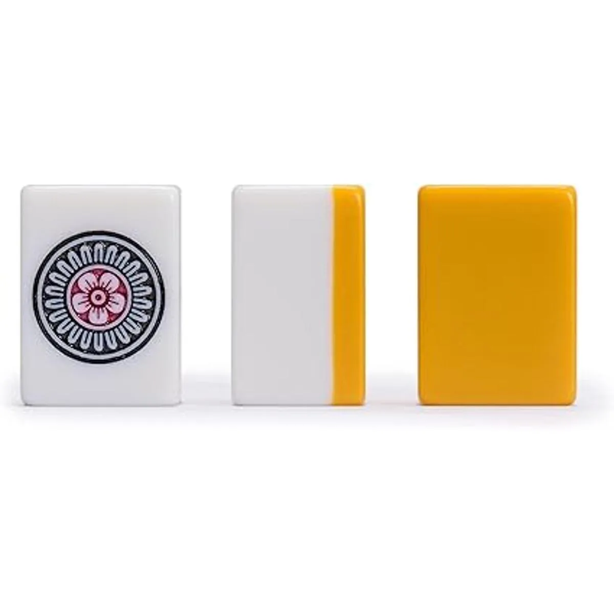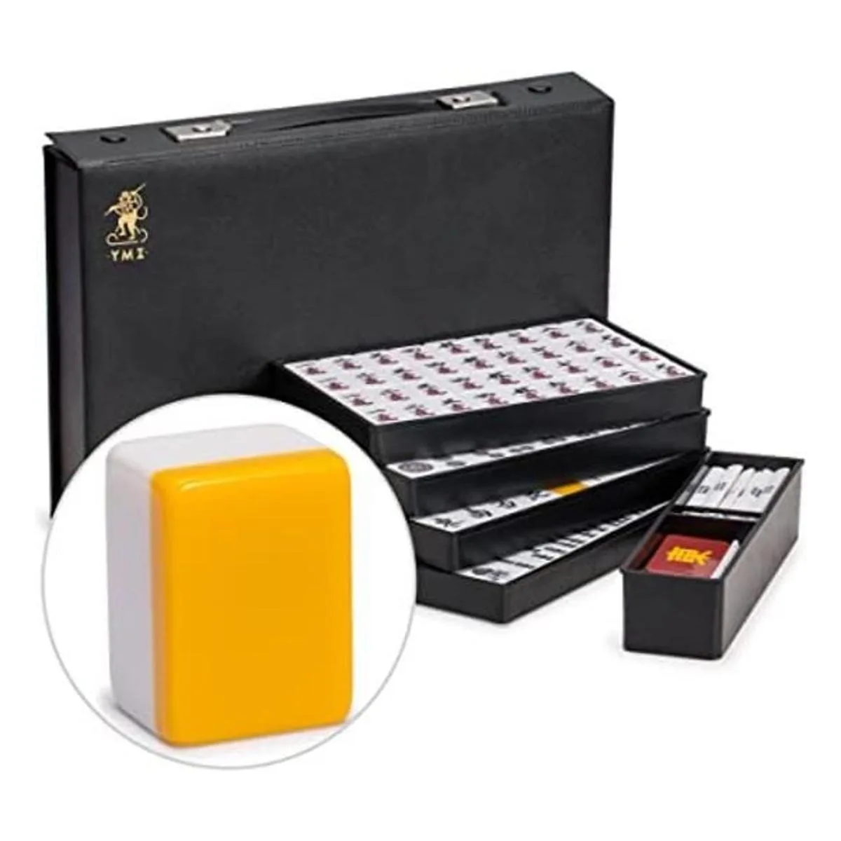 Yellow Mountain Imports Juego japonés Riichi Mahjong Azulejos de tamaño estándar blancos y amarillos con azulejos de viento oriental, juego de palos de apuesta, dados y caja de vinilo negro Hecho