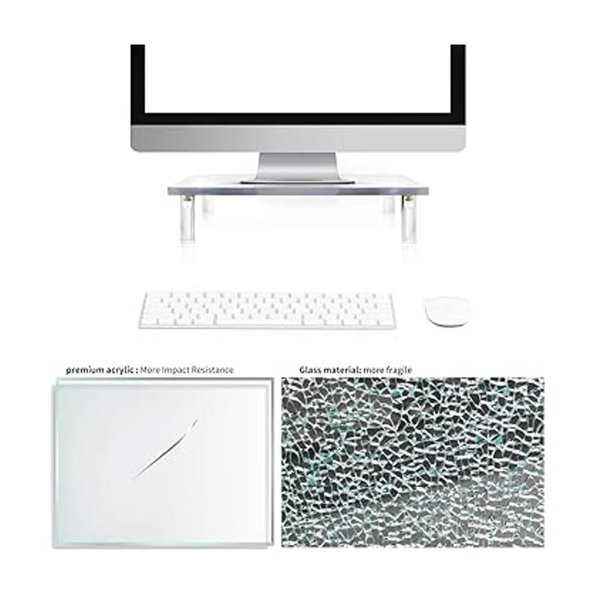 100 acrílico de alta calidad: el soporte acrílico de alta transparencia no solo hace que tu escritorio sea único, con una capacidad de carga de hasta 55 libras, sino que soporta fácilmente tu monitor de computadora, computadora de escritorio, impresoras, etc. La superficie lisa es más fácil de limpiar.