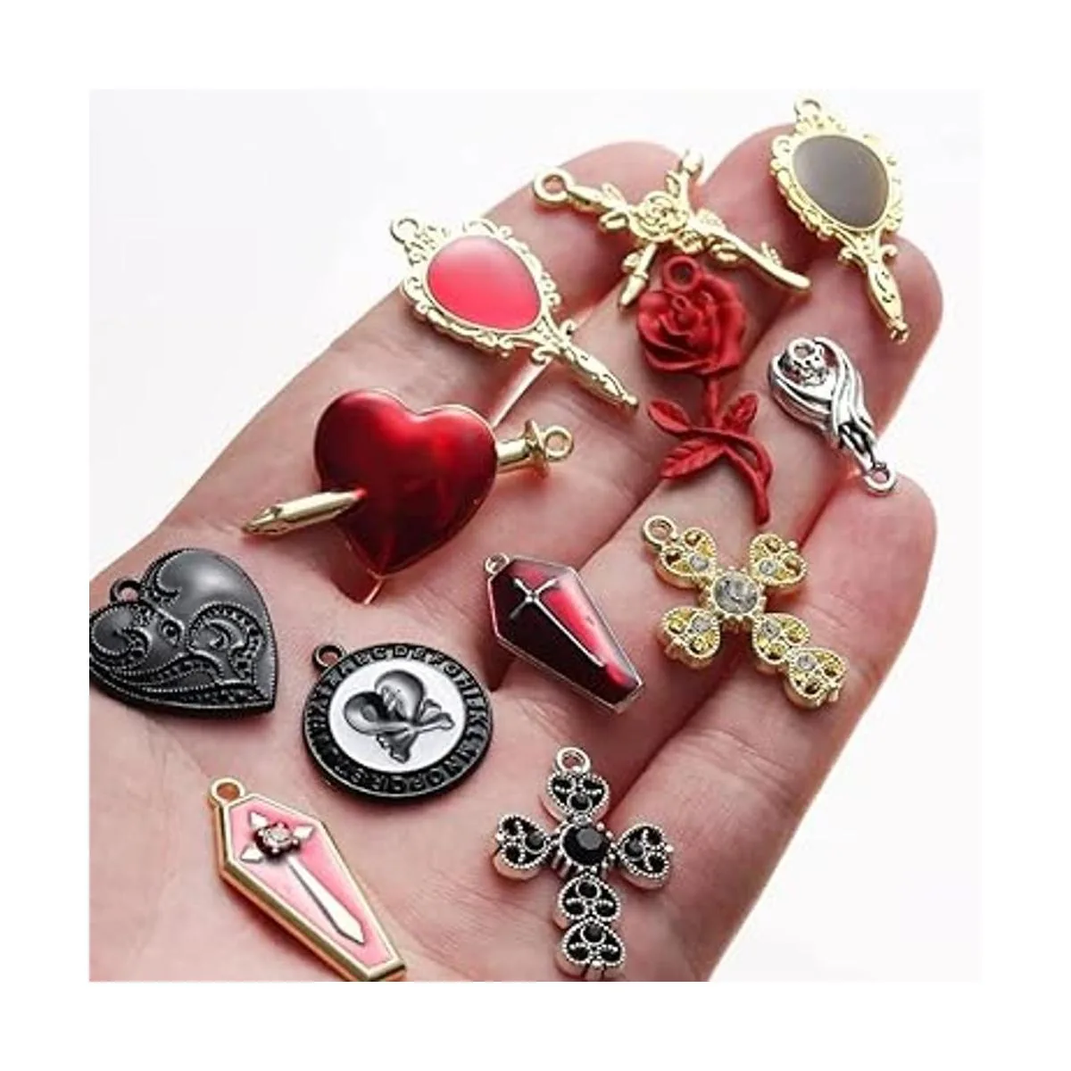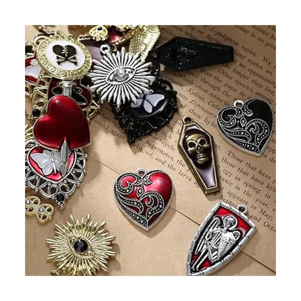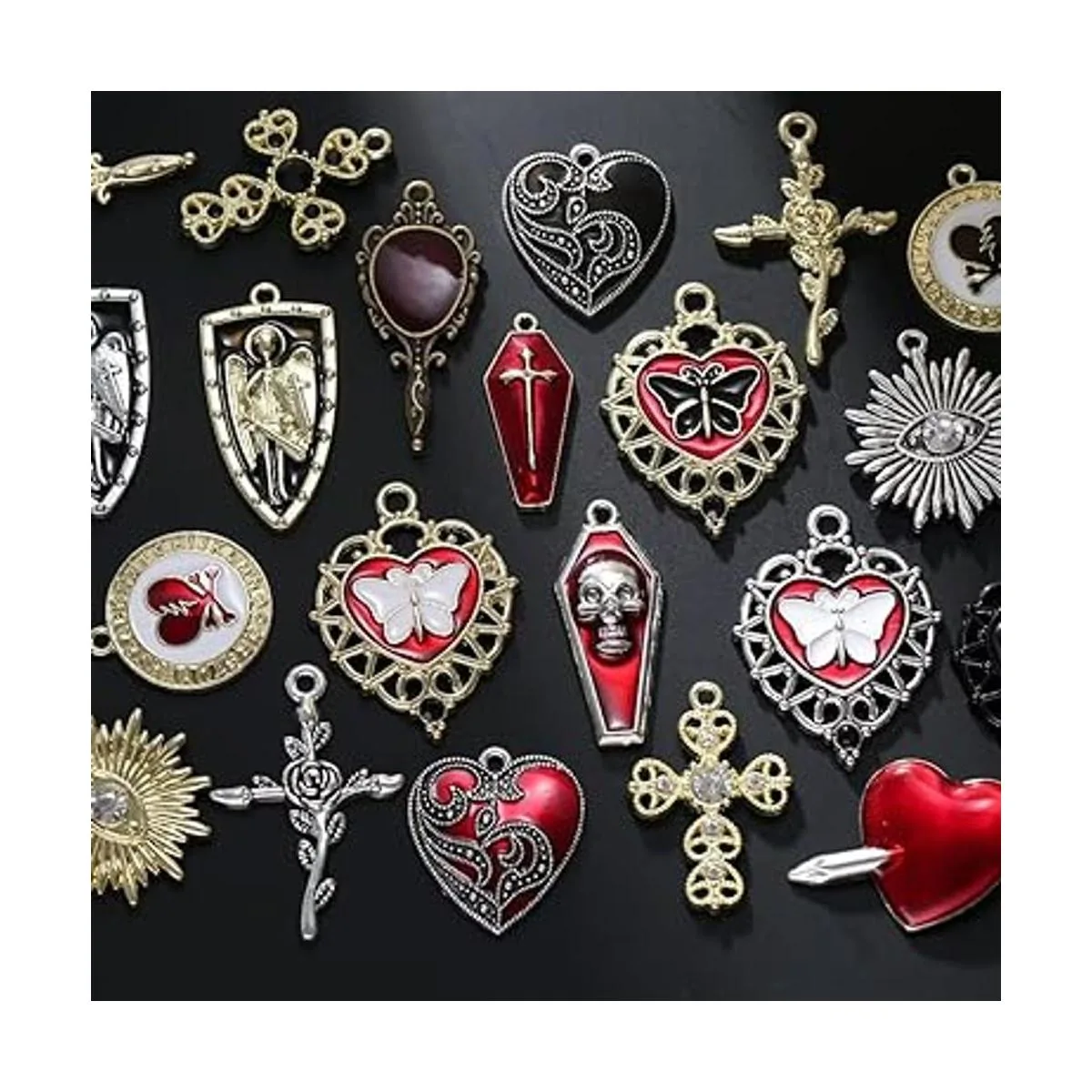Estilo: dijes de estilo gótico, dijes barrocos vintage dijes de calavera, dijes de flor de rosa, dijes de cruz, dijes de corazón, dijes de Halloween, dijes de espejo, dijes de mariposa en tres colores negros, dijes de color dorado, dijes de color rojo