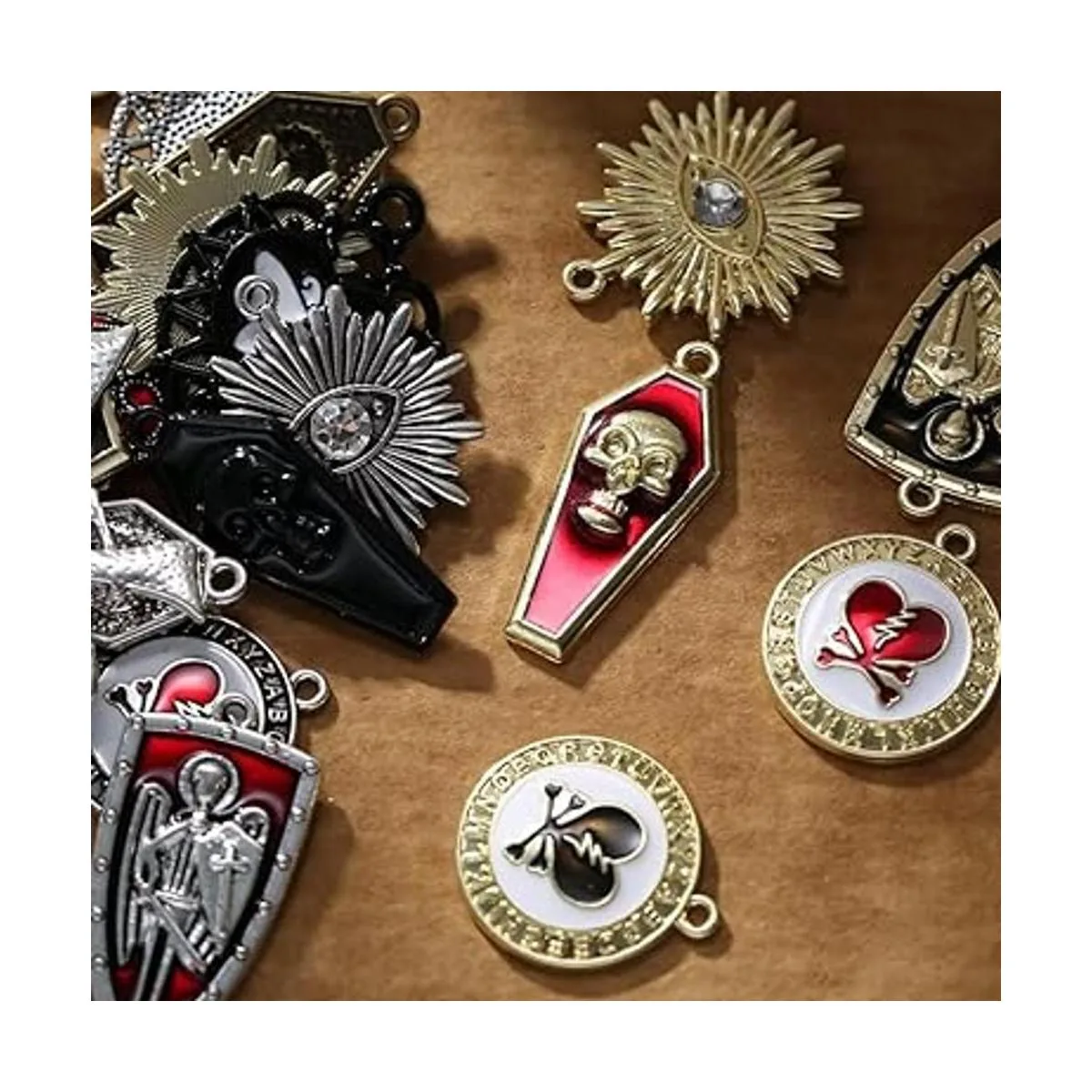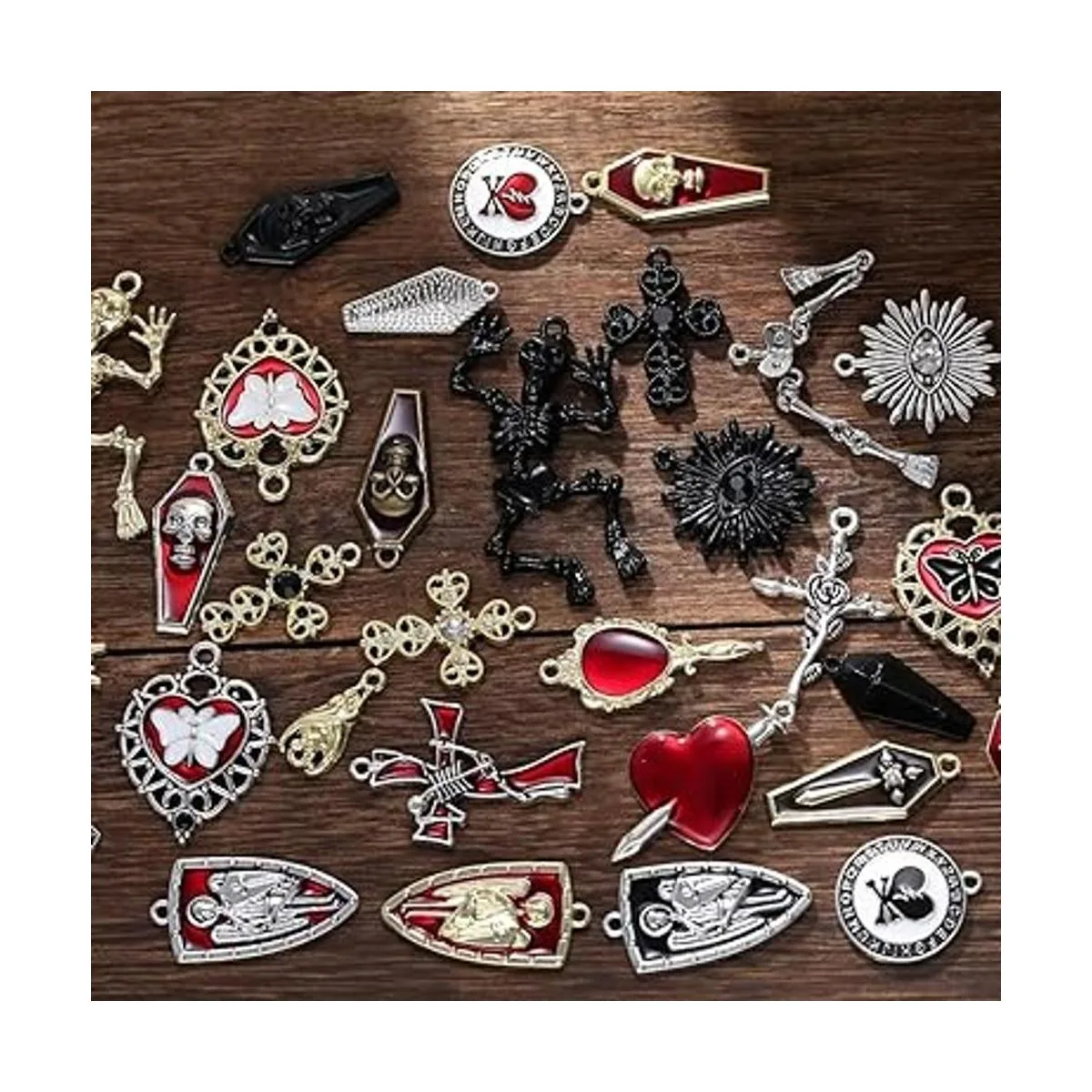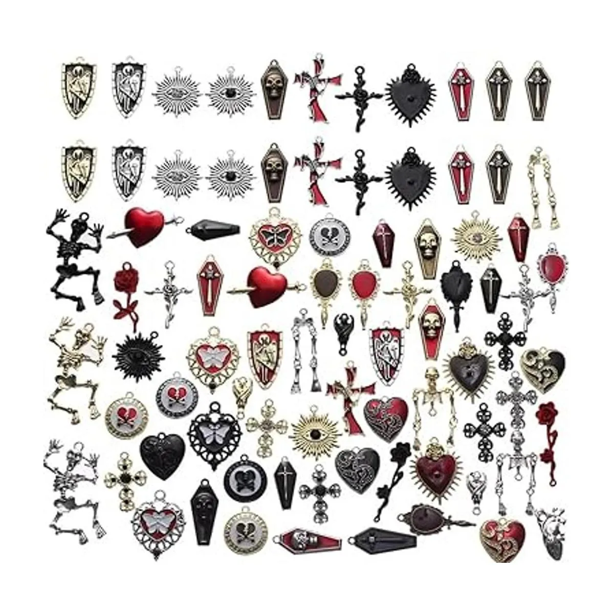 Estilo: dijes de estilo gótico, dijes barrocos vintage dijes de calavera, dijes de flor de rosa, dijes de cruz, dijes de corazón, dijes de Halloween, dijes de espejo, dijes de mariposa en tres colores negros, dijes de color dorado, dijes de color rojo