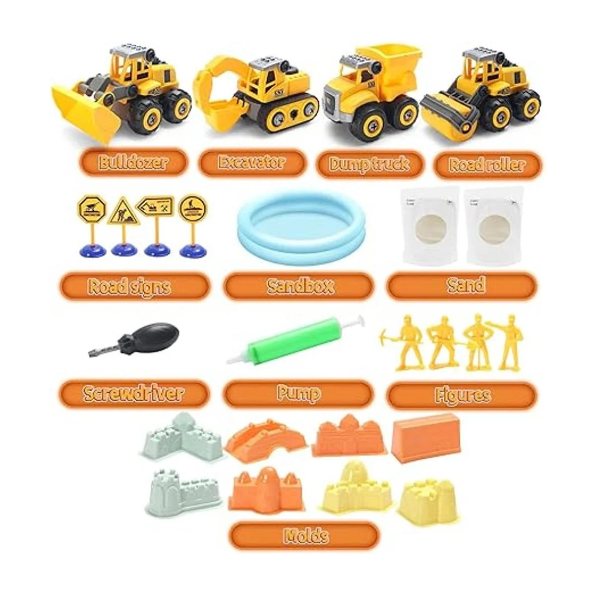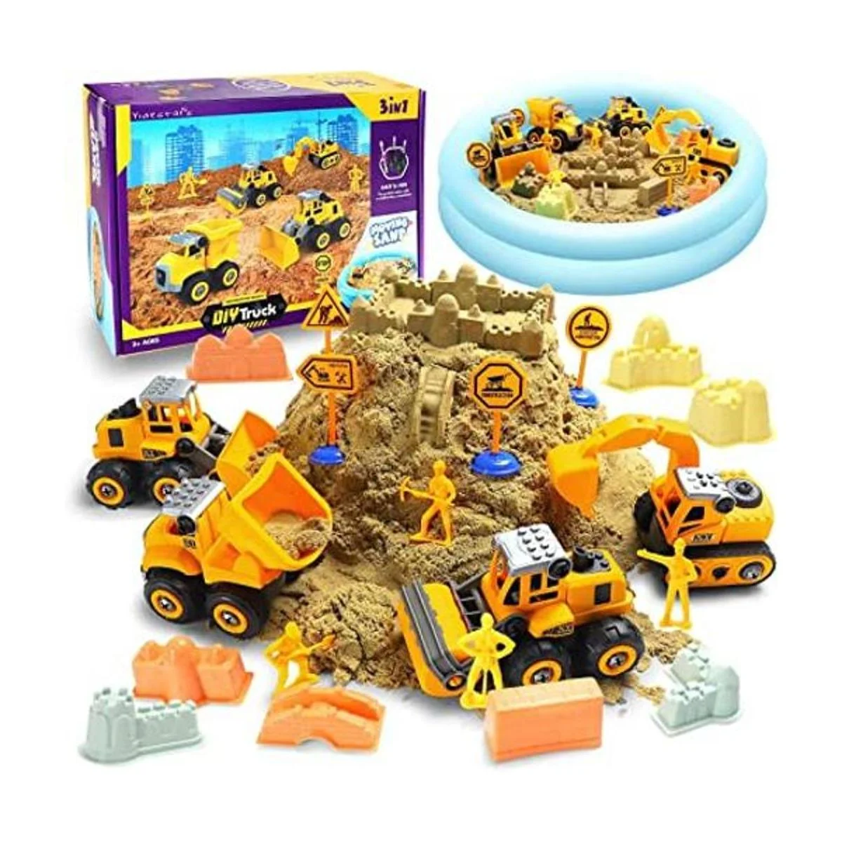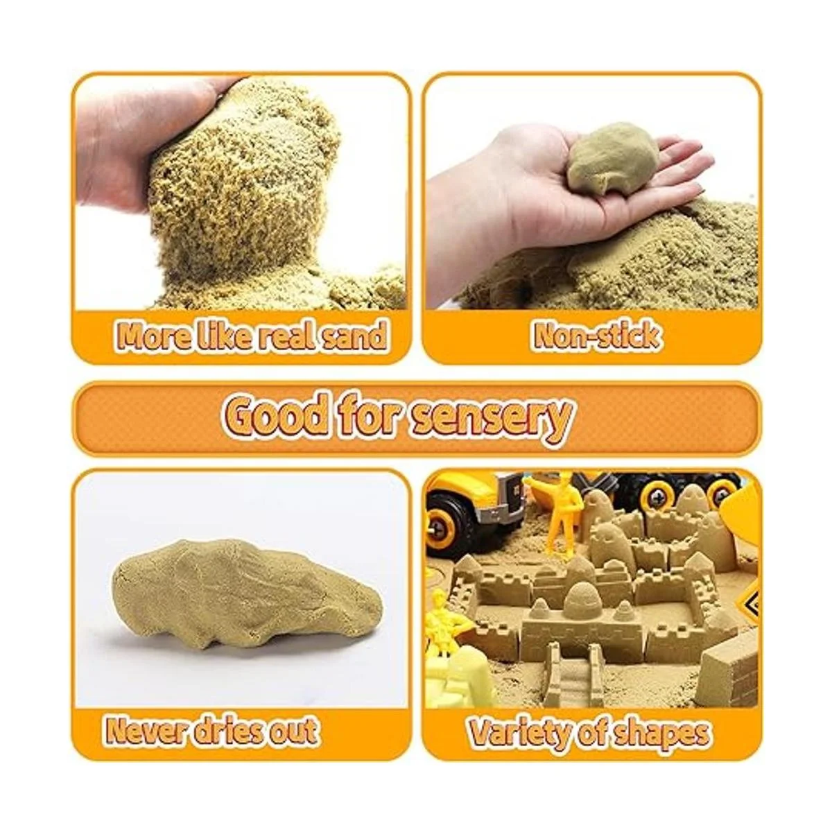 YIDESTARS Kit de arena de construcción de juego, arena mágica de 2.2 libras con 4 camiones grandes de construcción desmontables, 1 caja de arena, 8 figuras de trabajadores y señales de carretera, 8 moldes, juguetes para niños y niñas de 2 a 8 años