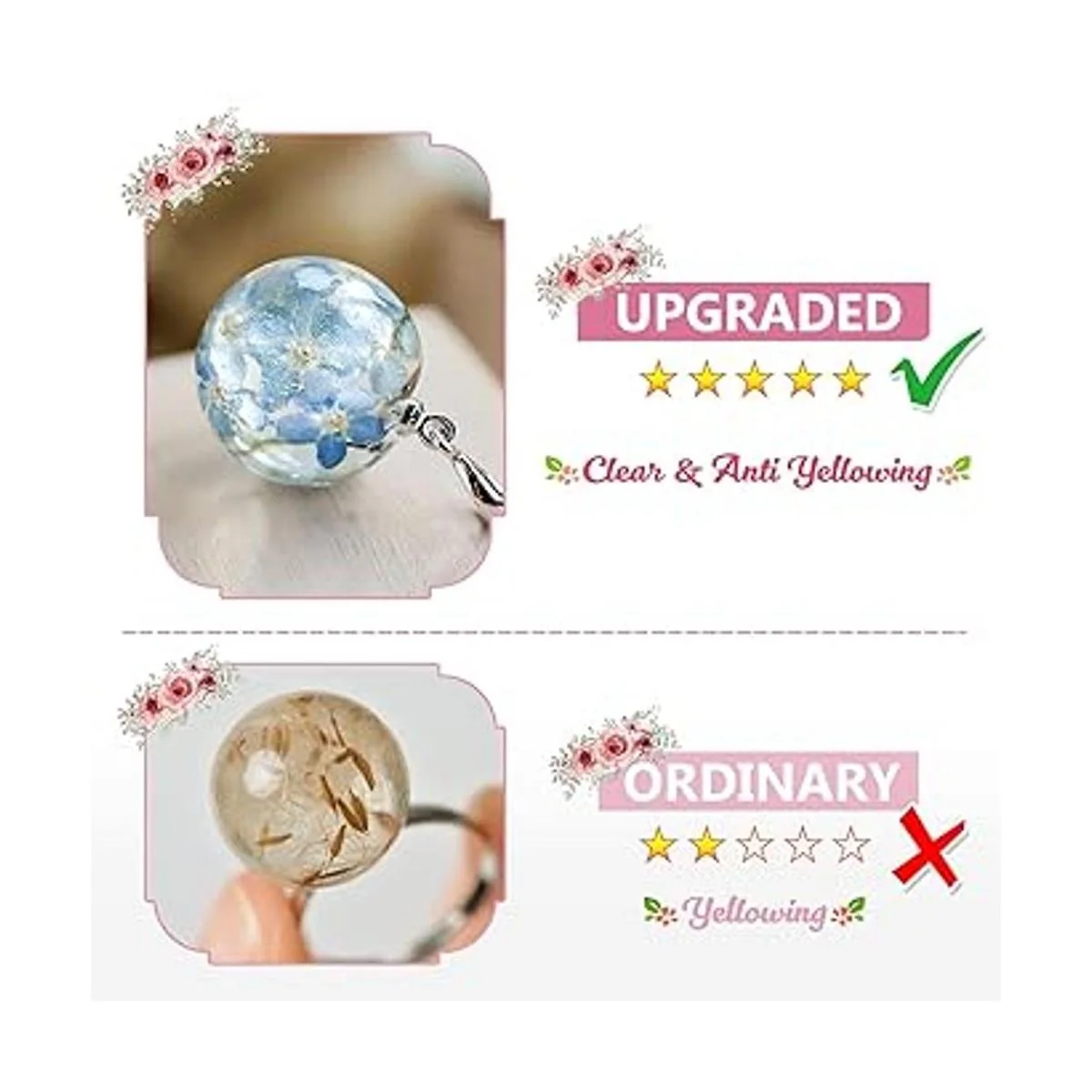 Resina epoxi UV de alta calidad de 10.58 oz: la resina epoxi utiliza materiales avanzados como bisfenol A, acrílico epoxi, que puede hacer que tenga un rendimiento de alta calidad en transparencia y dureza después del secado. Además, el BAEA permite que se seque rápidamente bajo la luz ultravioleta. El excelente rendimiento de la resina epoxi UV hace que el trabajo sea más perfecto. Puedes utilizar resina epoxi UV de alta calidad para hacer hermosas joyas para tus seres queridos, como collares, colgantes, aretes, llaveros y adornos.