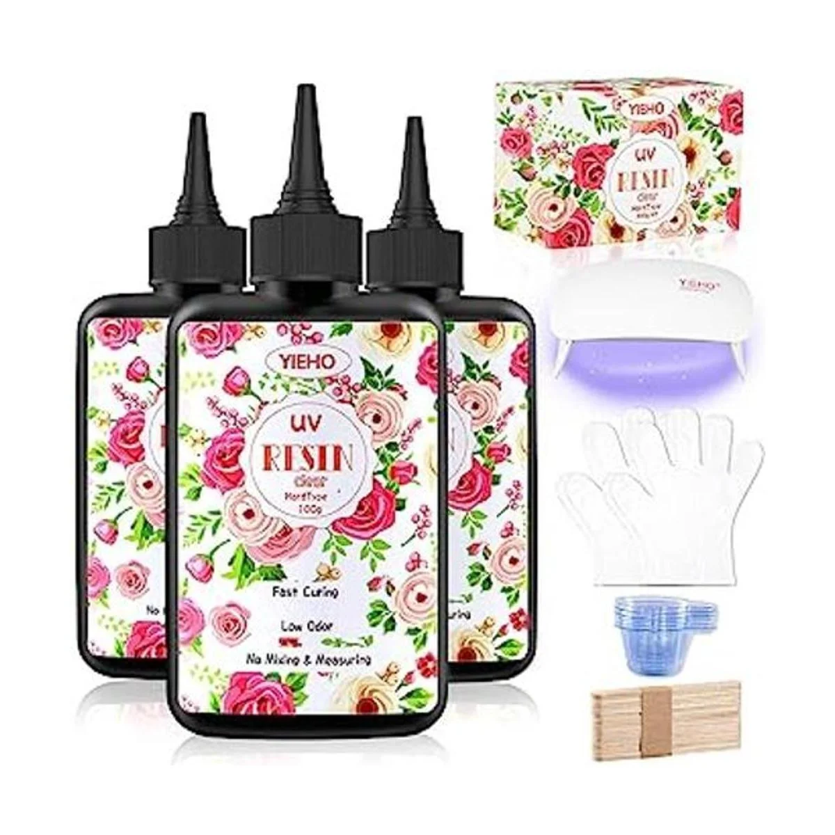 YIEHO Kit de resina UV de 10.58 oz con luz mejorada, cristal transparente, duro curado UV, suministros de inicio de resina epoxi premezclada para manualidades, fabricación de joyas para principiantes, con lámpara