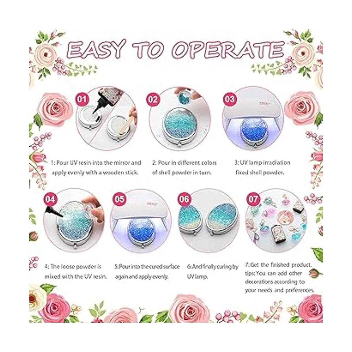 Servicio de calidad: puedes obtener 12 meses de servicio de devolución o cambio gratuito. Si tienes alguna insatisfacción con el producto, no dudes en ponerte en contacto con nosotros. Nuestro equipo te proporcionará un servicio al cliente de la más alta calidad en 12 horas. Como persona creativa, puedes hacer clic en Agregar al carrito y disfrutar compartiendo tus hermosas creaciones con tus amigos con la resina UV transparente.