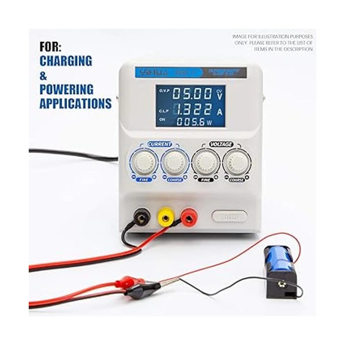 Esta fuente de alimentación cuenta con una pantalla LED que muestra los parámetros de voltaje, corriente y potencia. Una pantalla de corriente muestra hasta cada mA miliamperios / 0,001 A y una pantalla de voltaje que lee hasta cada 10 mV milivoltios / 0,010 V. Esta pantalla LCD también muestra el estado de C.C. o C.V. Modos, protección contra sobrevoltaje y protección de corriente constante.