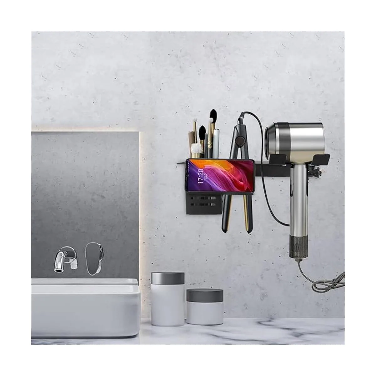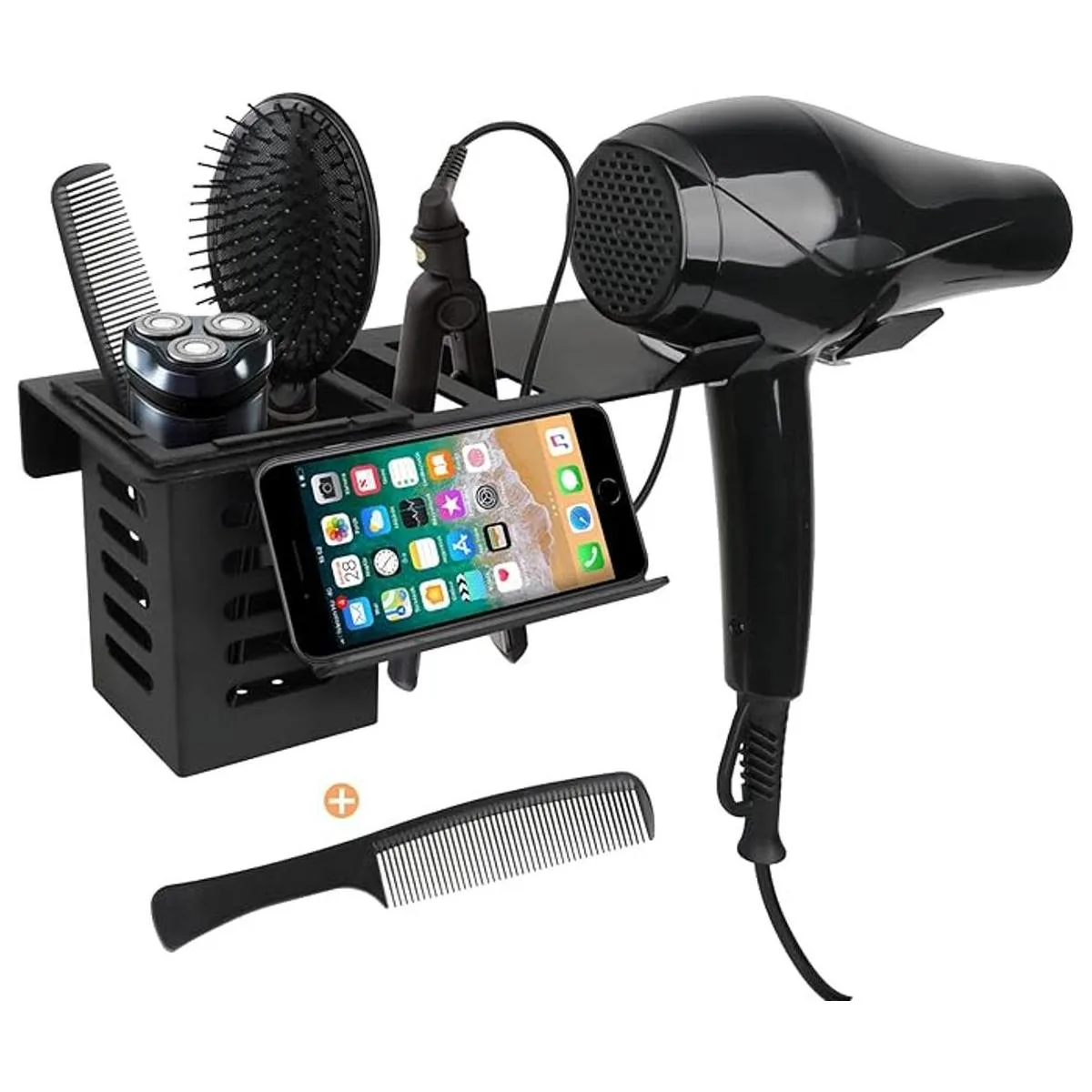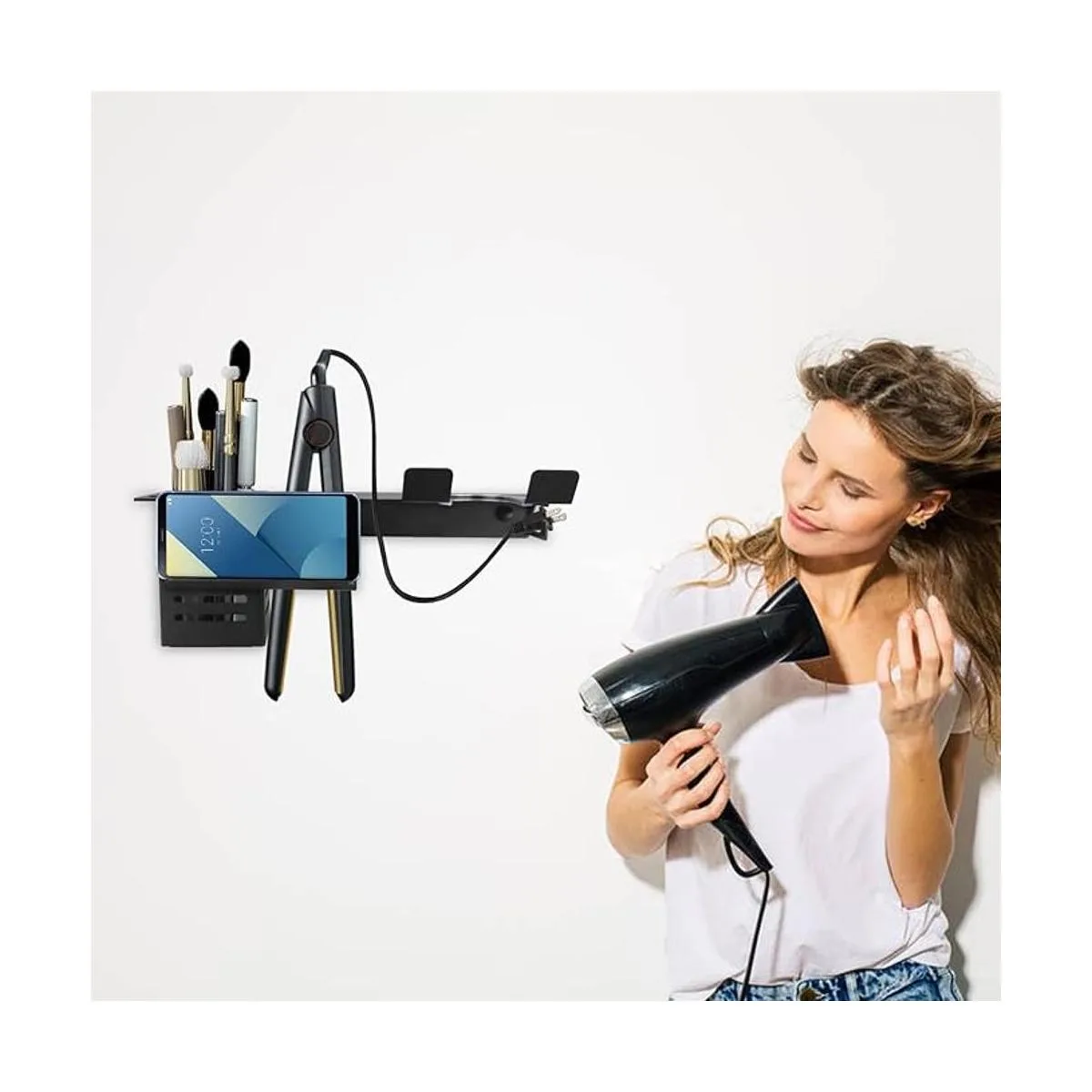 Yimerlen Soporte para secadora y alisadora, soporte para el cabello, organizador de herramientas para montar en la pared, alisadoras de baño negro, con soporte para teléfono celular