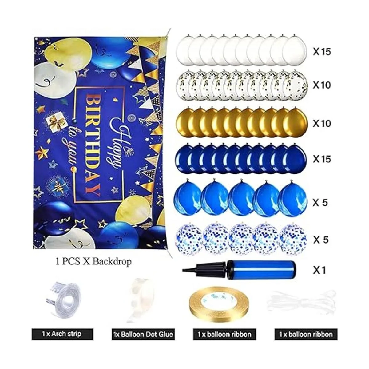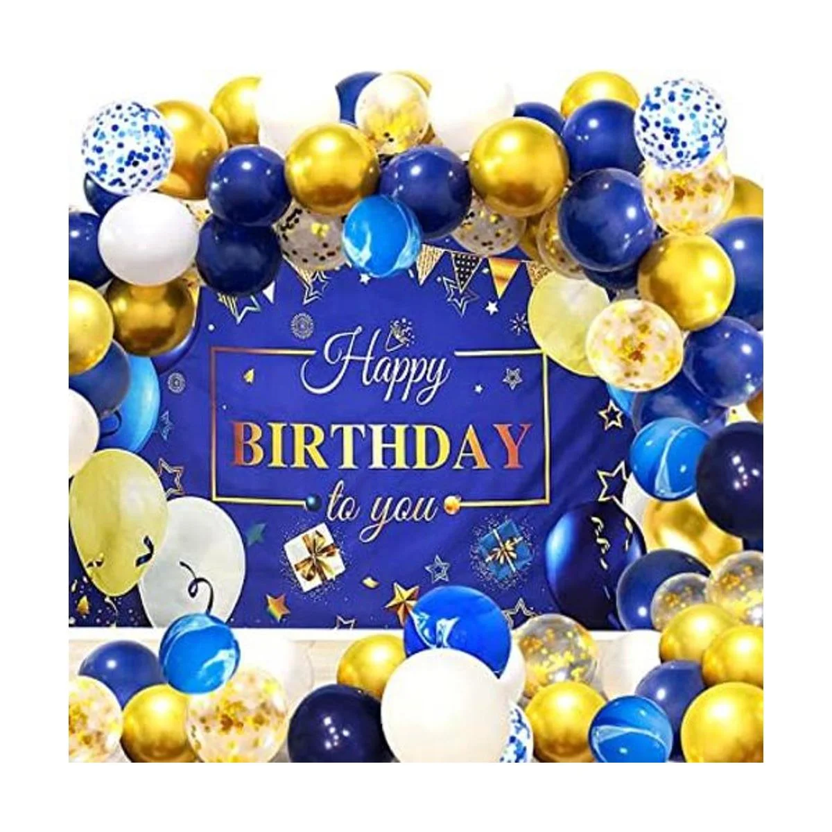 YinQin 66 decoraciones de fiesta de cumpleaños azul marino y dorado incluyen 1 pancarta de fondo de feliz cumpleaños, 60 globos de 12 pulgadas blanco: 15 piezas, azul: 15 piezas, dorado: 10 piezas, globos de confeti dorados: 10 piezas, globos de ágata azul: 5 piezas, globos de confeti azul: 5 piezas, 1 bomba de globo, 1 cinta de telón de fondo. 1 pegamento. ot, 1 cinta de globo y 1 cadena de decoración de globos.