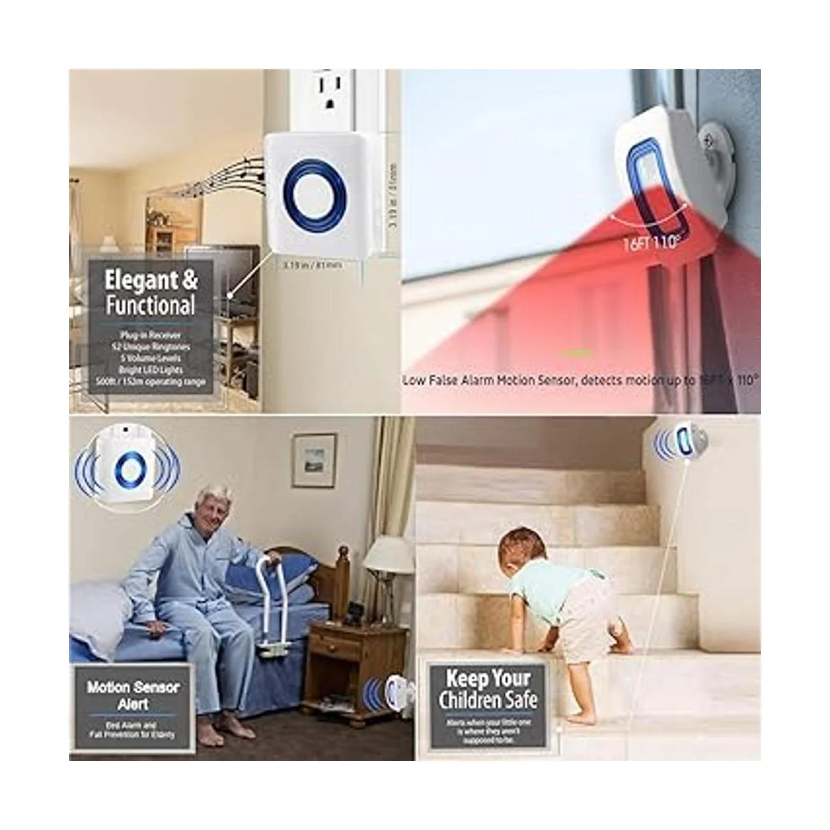 Amplia distancia y rango: el sensor de seguridad del detector de movimiento detecta movimiento dentro de un rango de 16.4 pies x 110. Transmite la señal a receptores dentro de los 500 pies en área abierta. Con soporte de montaje ajustable opcional.