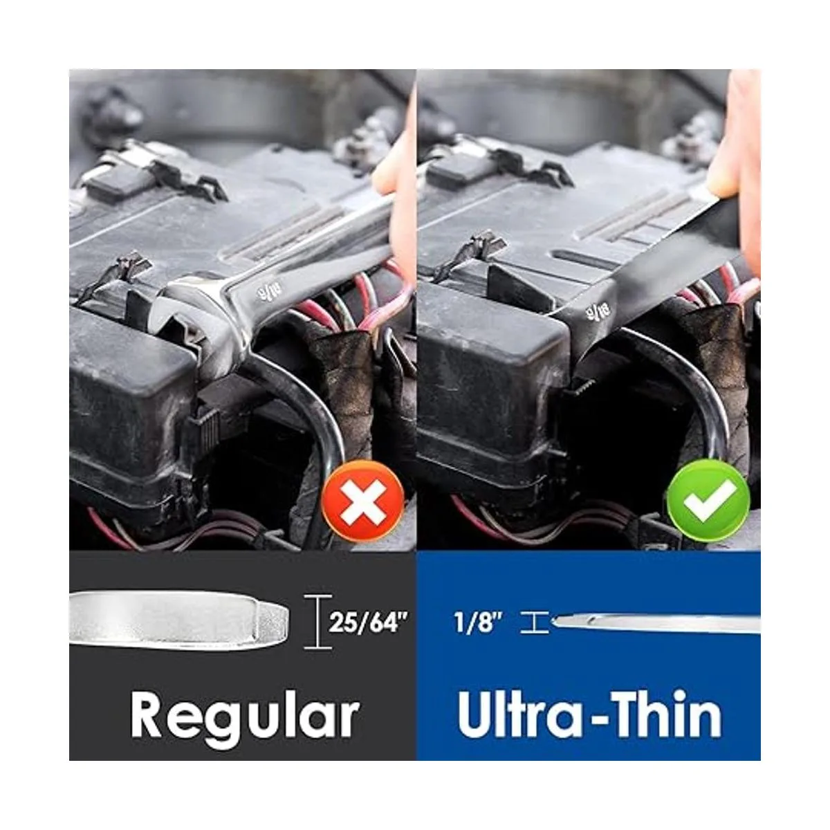 Superdelgado de 1/8 pulgadas: hasta un 70 más delgado que las llaves normales, las llaves superfinas te permiten llegar a los sujetadores en el hueco estrecho. El perfil ultra delgado se adapta bien a tuercas finas, extracciones difíciles, espacios estrechos y áreas de trabajo de difícil acceso.