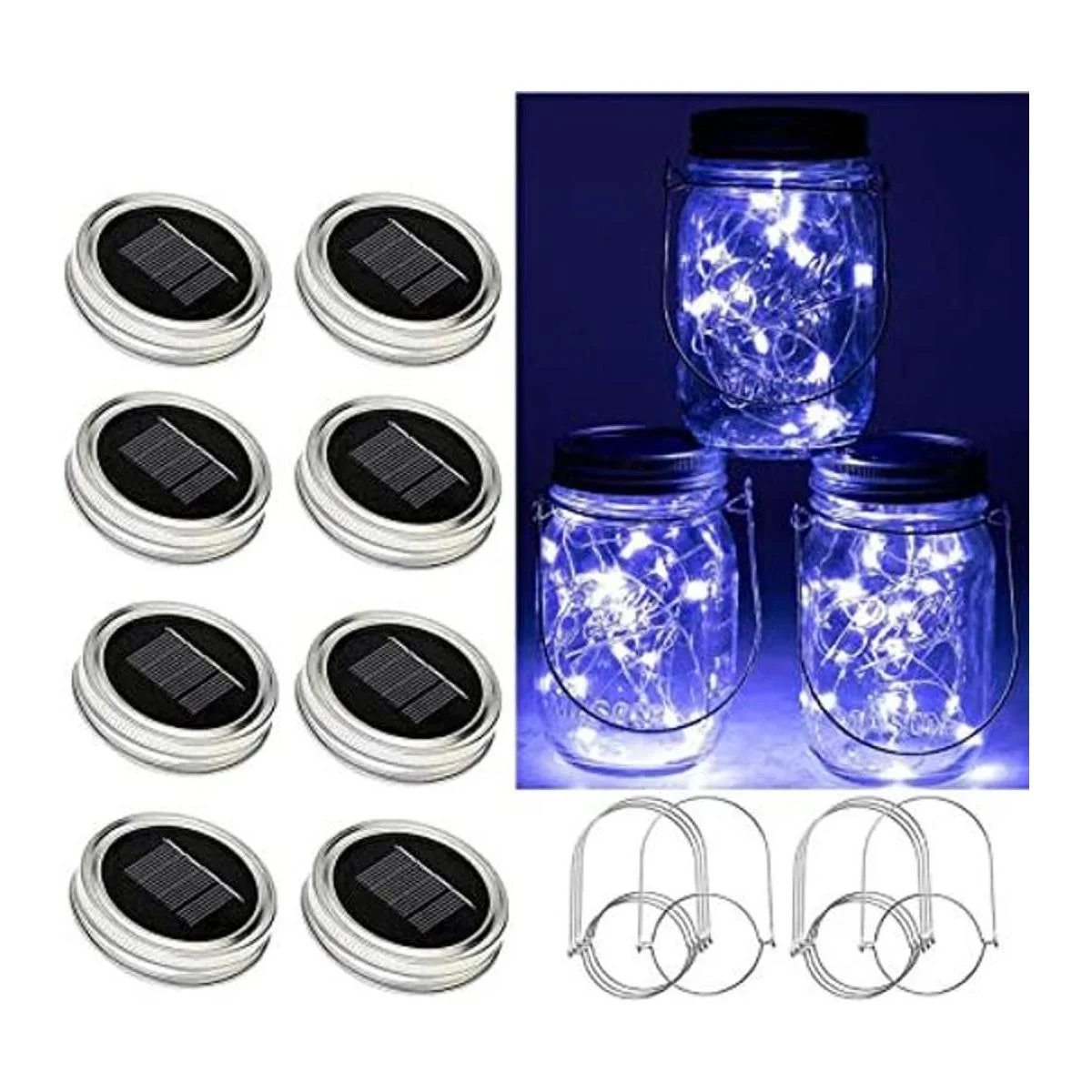 YJFWAL Luz solar para tapa de masón, paquete de 8 30 luces LED para tarros de masón, incluye 8 ganchos y 2 piezas de decoración de hadas de PVC tarros no incluidos, ideal para patio, jardín, decoración interior blanco frío