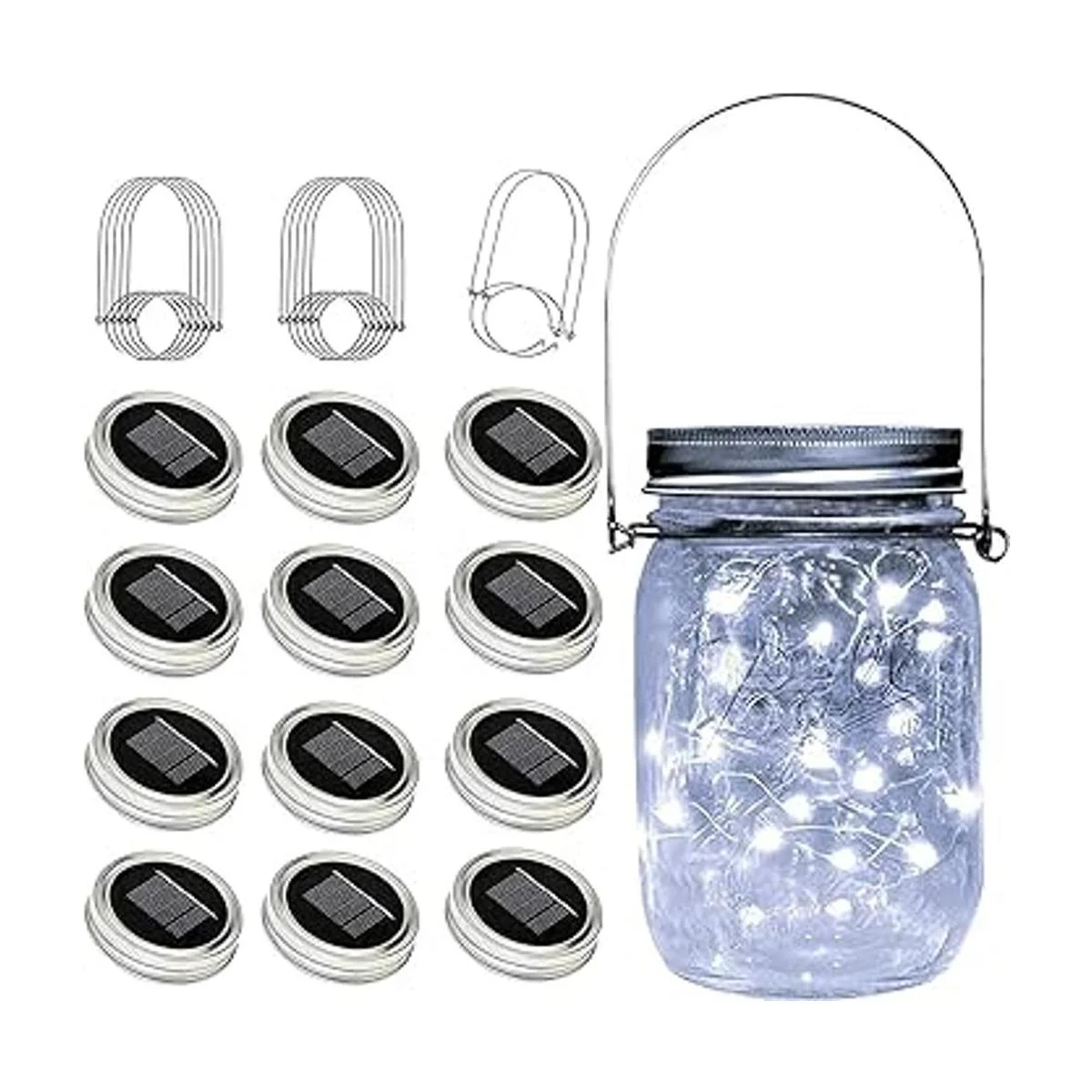 YJFWAL Mason Jar Luces solares de tarro, paquete de 12 unidades de 30 luces LED con tapa de luciérnaga con 12 ganchos y 3 cloruro de polivinilo sin tarros, para tarros de masón, patio, jardín, boda, linterna blanco frío