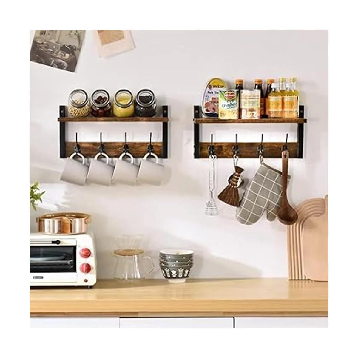 Space Saving: Storage shelves and hooks can help organize cluttered entryway and save space. It can be placed in the kitchen to store coffee cups and kitchen utensils, in the bedroom to store toiletries and towels, and it is also a good choice in the bedroom.