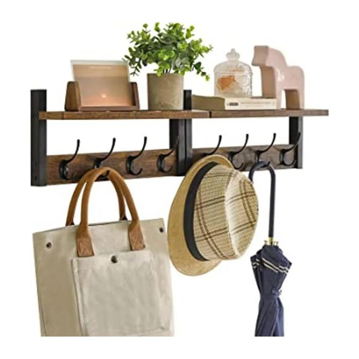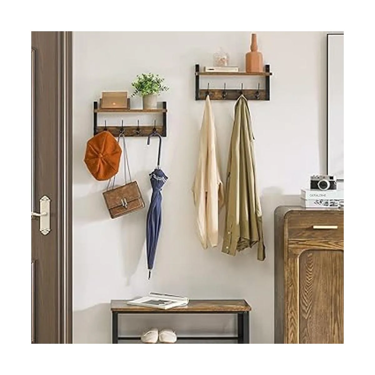 2in1 Design: Each wall coat hanger has a 15.754.3inch panel on top, which provides additional storage space for photo frames, potted plants and collectibles, etc. It is equipped with 8 smooth hooks to store clothes, bags, keys, umbrellas, etc.