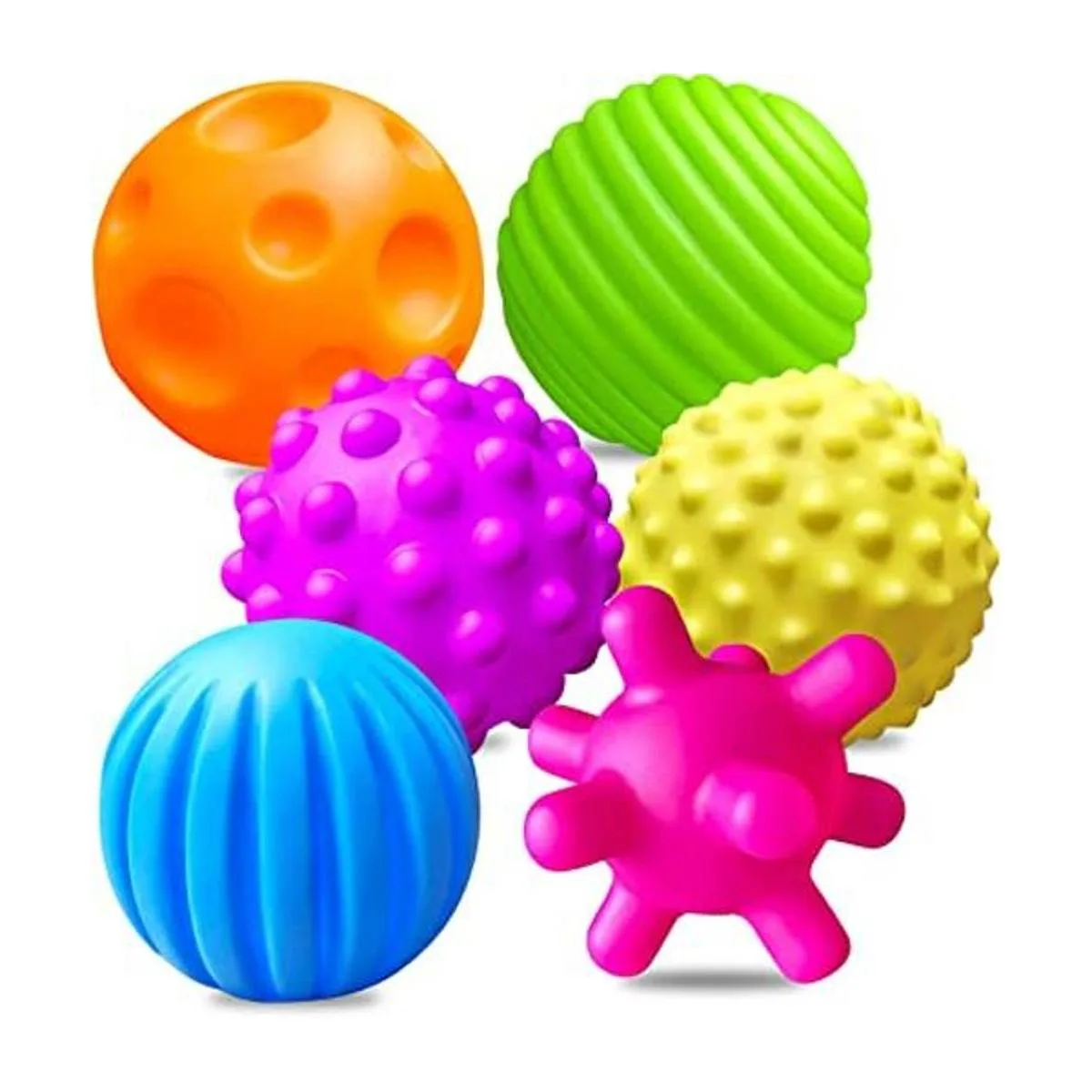 Gran valor: paquete de 6 bolas sensoriales de diferentes colores brillantes y formas para niños pequeños, material suave y texturizado, que anima a los niños a alcanzar, agarrar y disfrutar del juego sensorial, cultivar las manos de los niños y la percepción del color.