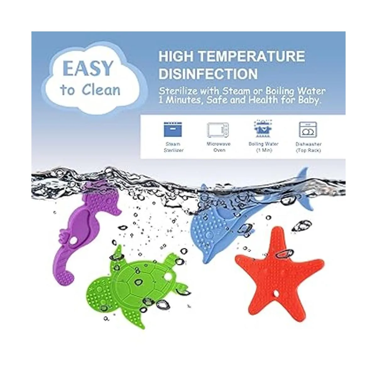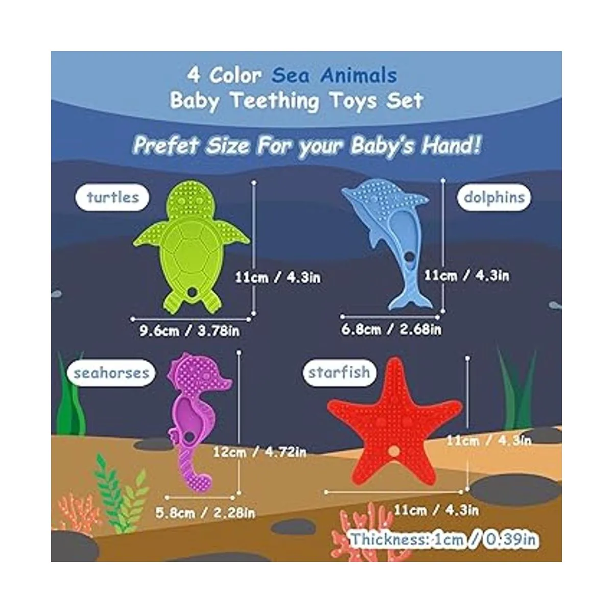 Diseño elegante y único: cuatro tamaños diferentes de formas de animales marinos de juguetes masticables molares para bebés delfín, tortuga, caballito de mar, estrella de mar, el tamaño perfecto para que el bebé lo agarre. Los colores brillantes son más fáciles para atraer la atención de tu bebé. La textura de la superficie es desigual, la textura es equilibrada, no demasiado suave ni demasiado dura, lo que permite al bebé disfrutar de la diversión de masticar.