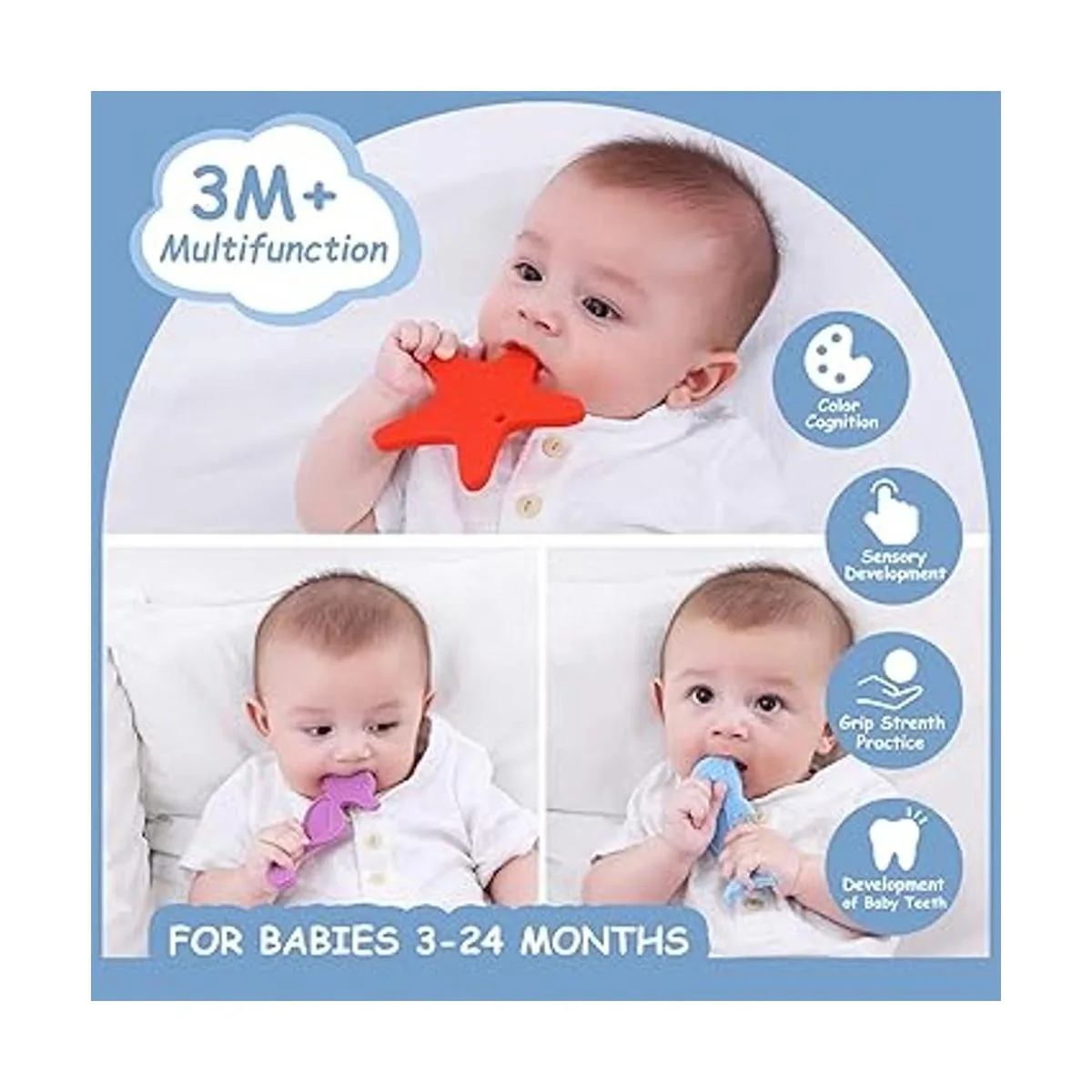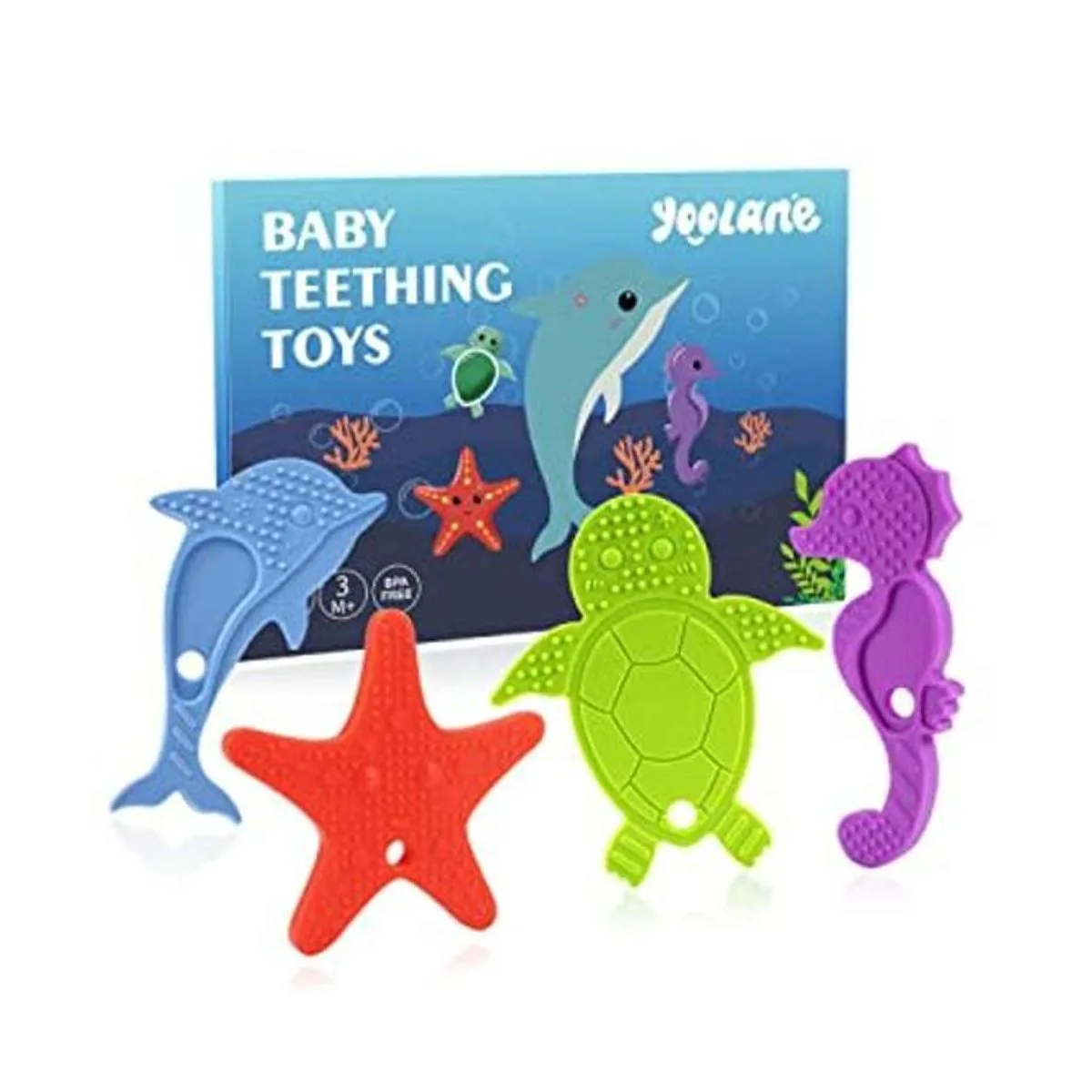 Yoolane Juguete de dentición para bebés, juguetes mordedores para bebés de 3 a 24 meses, juego de juguetes de silicona para mordedores de animales marinos, juguetes mordedores molares para bebés y niñas, congelador sin BPA paquete de 4