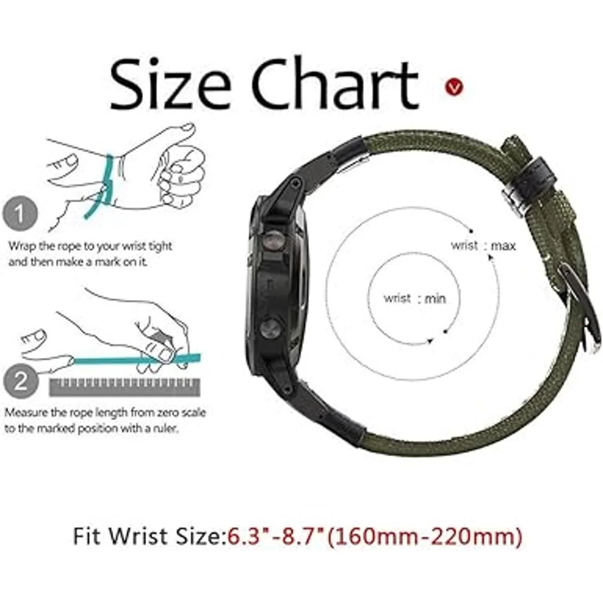 Tamaño de muñeca: se adapta a muñecas de 160 a 8.661 in. Múltiples agujeros alternativos y hebilla de acero inoxidable que te permiten elegir el tamaño cómodo para tu muñeca.