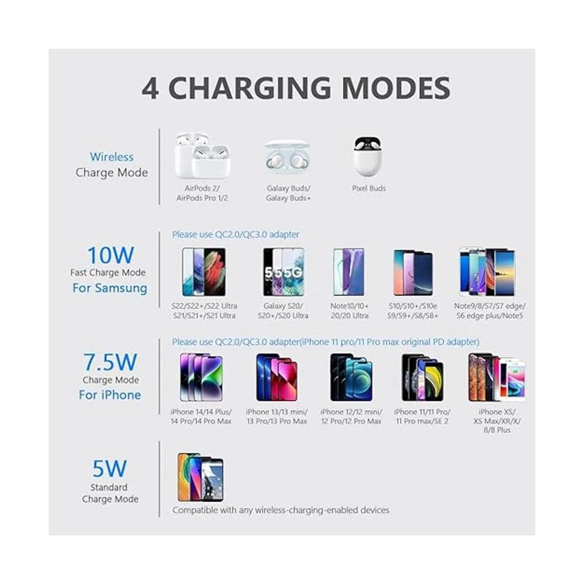 3 modos de carga disponibles para diferentes teléfonos: el modo de carga de 7.5 W es compatible con iPhone 14/13/13 Pro/13 Mini/13 Pro Max/SE 2022/12/SE 2020/11/XS/XR/X/8; el modo de carga de 10 W es compatible con S22 Ultra/S21/S21/S20/Note 10/10 Plus/S10/S10 Plus/S10E/Note9/S9/S8 y así sucesivamente; el modo de carga de 5 W funciona en cualquier dispositivo habilitado para carga inalámbrica como Google Pixel 3/3XL/4XL y otros teléfonos habilitados para carga inalámbrica. Nota: el adaptador no está incluido, se recomienda encarecidamente el adaptador QC 2.0/3.0.