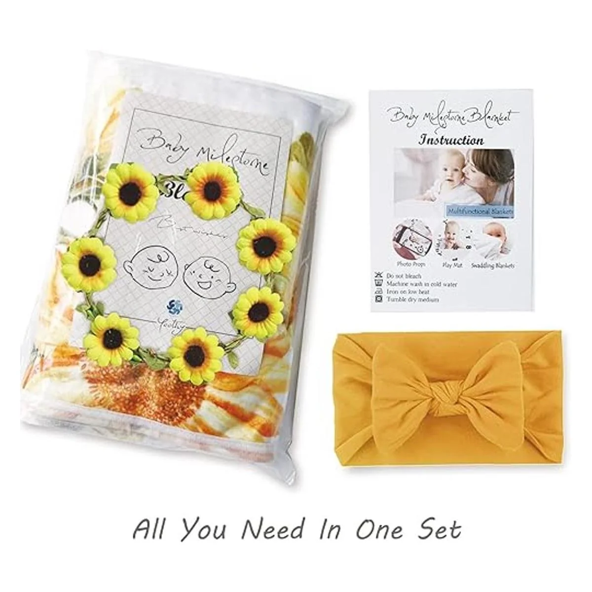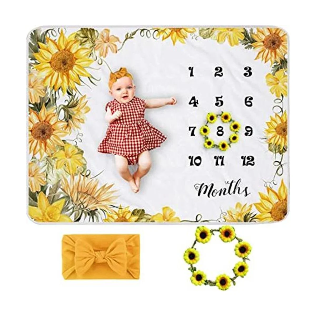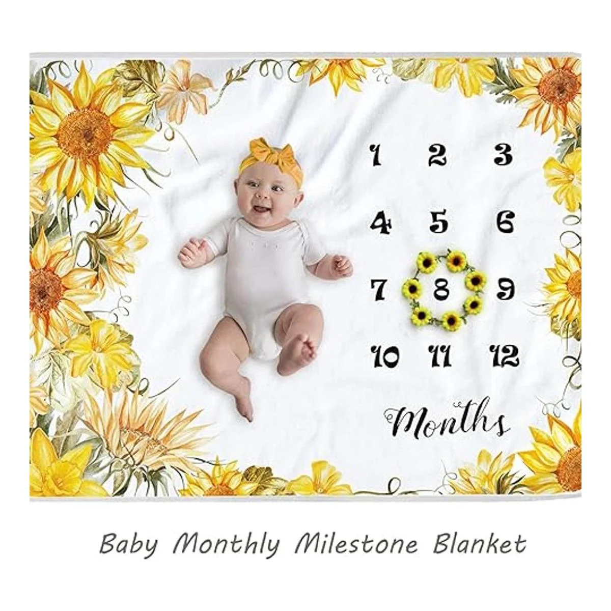 Yoothy Manta mensual de girasol para bebé, manta de mes floral para recién nacidos, regalo para baby shower, manta de felpa suave, corona y diadema incluidas, 45 x 40 pulgadas