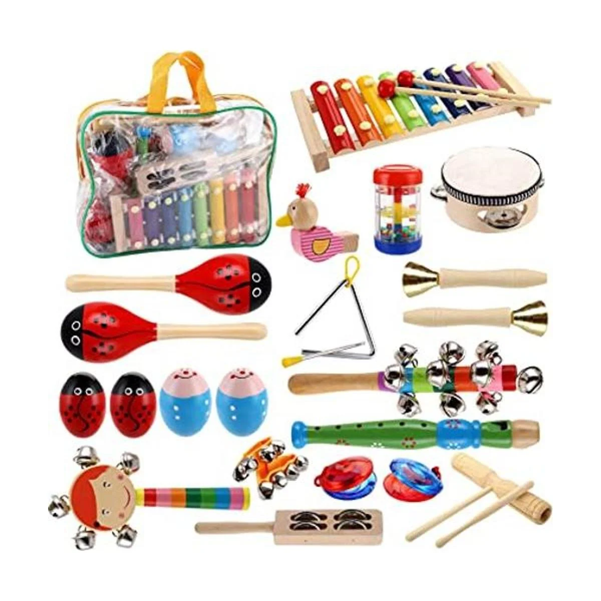Un juego completo de instrumentos de ritmo de madera natural. El juego de instrumentos musicales Yopay incluye 15 tipos de juguetes musicales de 25 piezas, vienen con instrumentos de sacudida, golpeando, golpeando y soplando. Es todo lo que necesitas para presentar a tu hijo el maravilloso mundo de la música