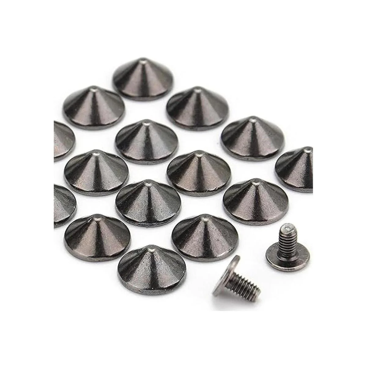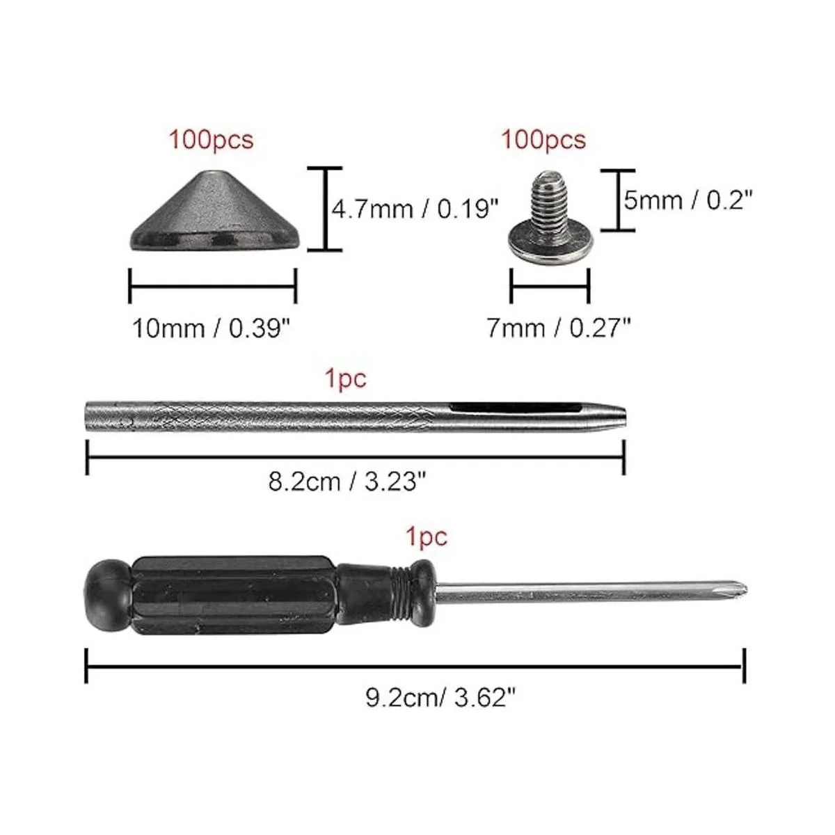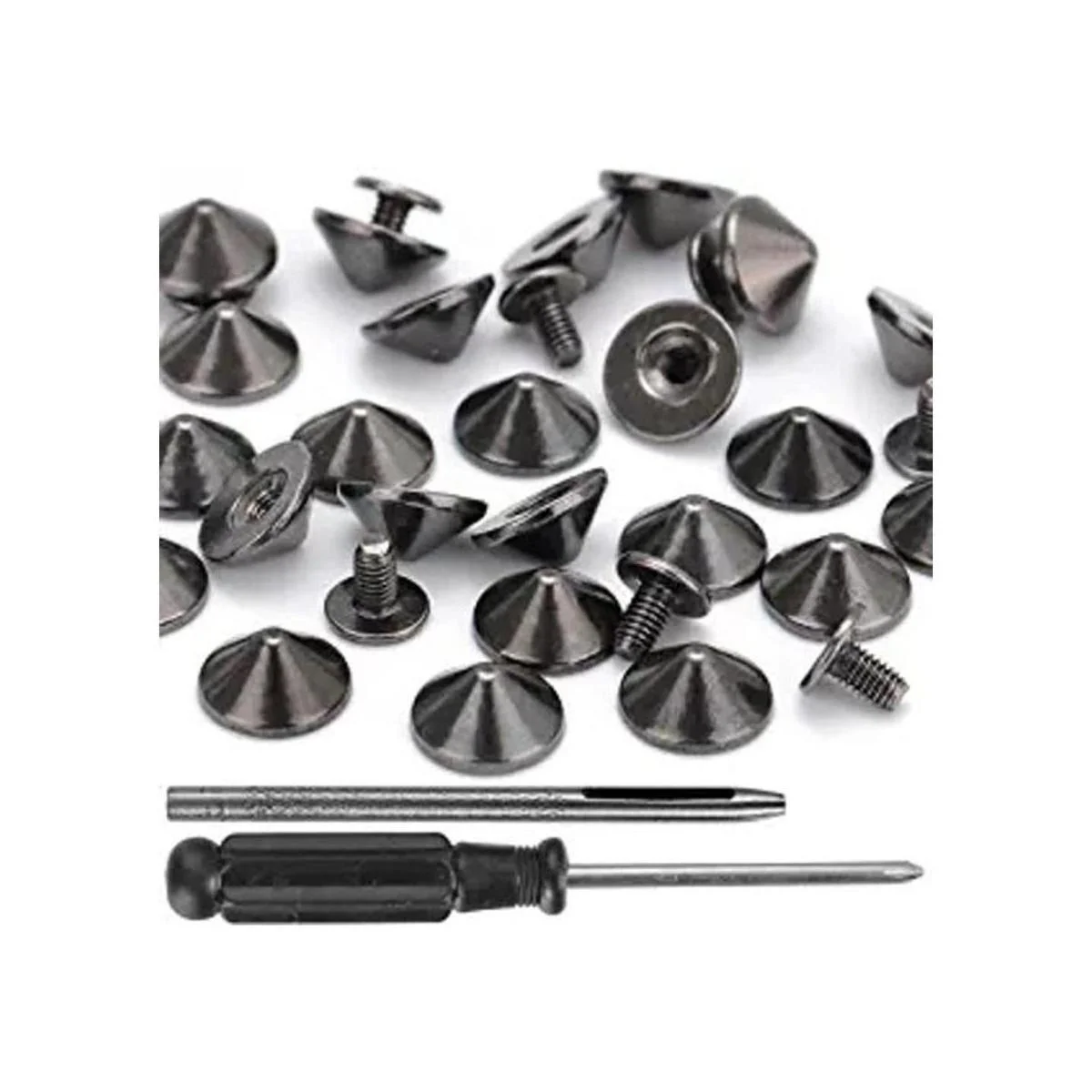 YORANYO 100 juegos de picos de cono y tachuelas de 0.185 in de altura de metal pistola de 316 pulgadas de bala de rosca trasera punk, tachuelas y picos para ropa, zapatos, cinturones de cuero, bolsas de accesorios con herramientas de instalación