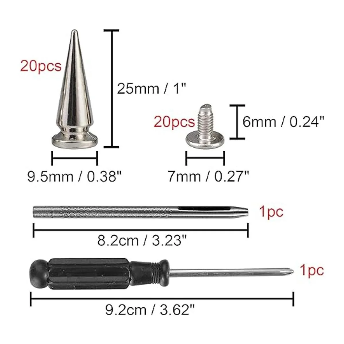 El paquete contiene: 20 juegos de tachuelas plateadas con tornillos y herramientas de instalación. Viene con bolsa blanca con cremallera.