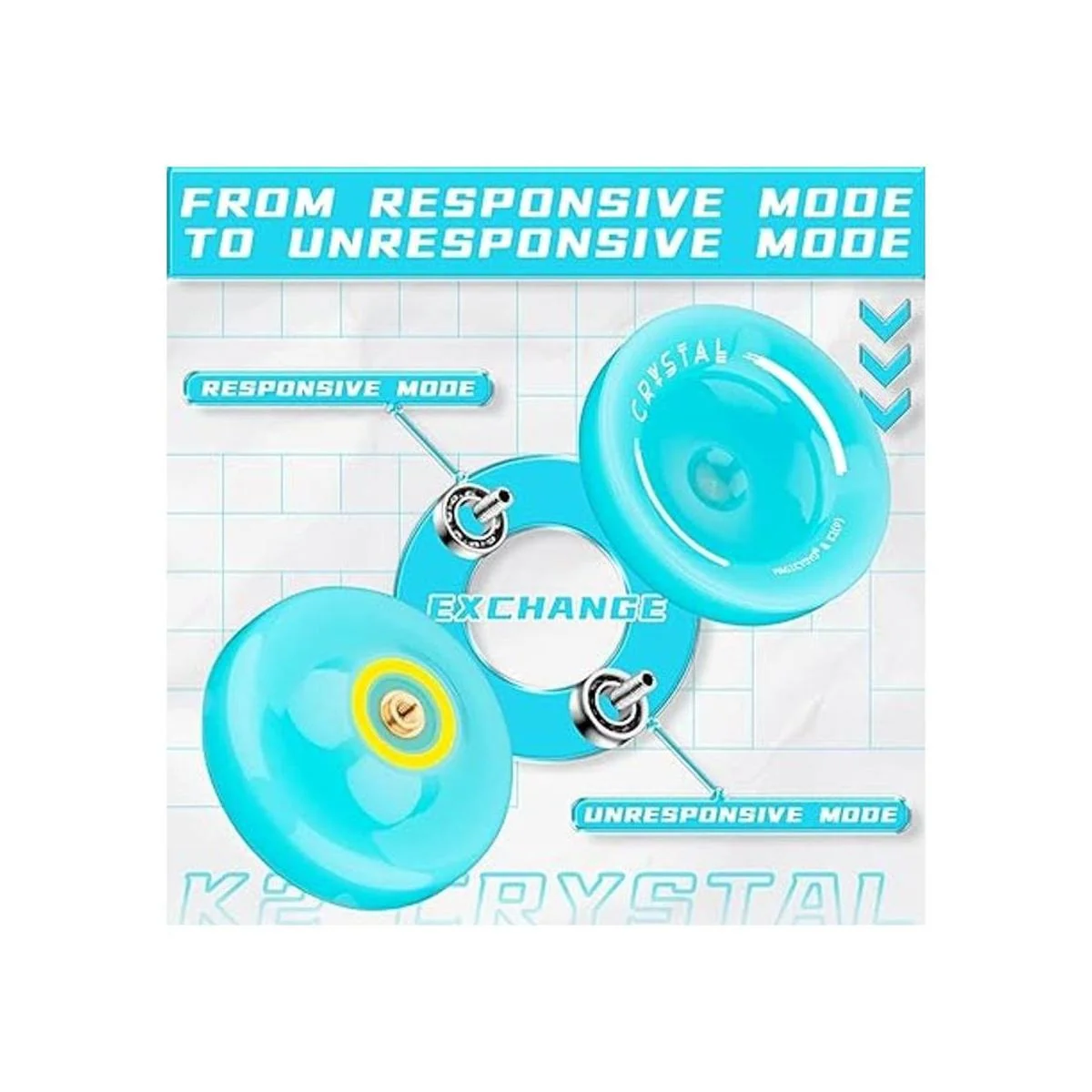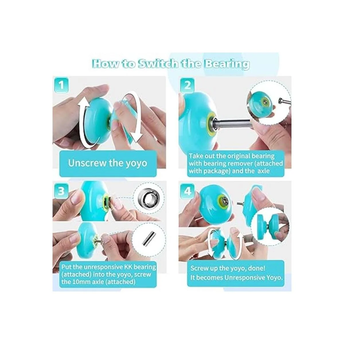 Importante: 1. Para el modo de yoyo sensible, si el yo yo no vuelve sensiblemente, se recomienda añadir poco aceite lubricante o aceite inoxidable en el rodamiento añadir el aceite dentro y fuera del rodamiento. 2. Después de cambiar a yoyo que no responde, no volverá a tu mano cuando lo tires hacia arriba. Tendrás que aprender un truco llamado vínculo para traer el yoyo de vuelta.