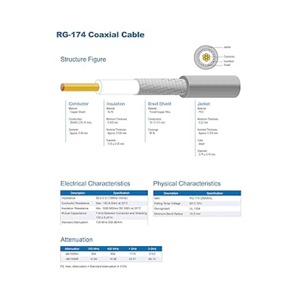 Tipo de cable y detalles Cable de puente BNC macho a conector hembra BNC. Tipo de cable: RG174Longitud del cable: 6 pies; Impedancia: 50 ohmios