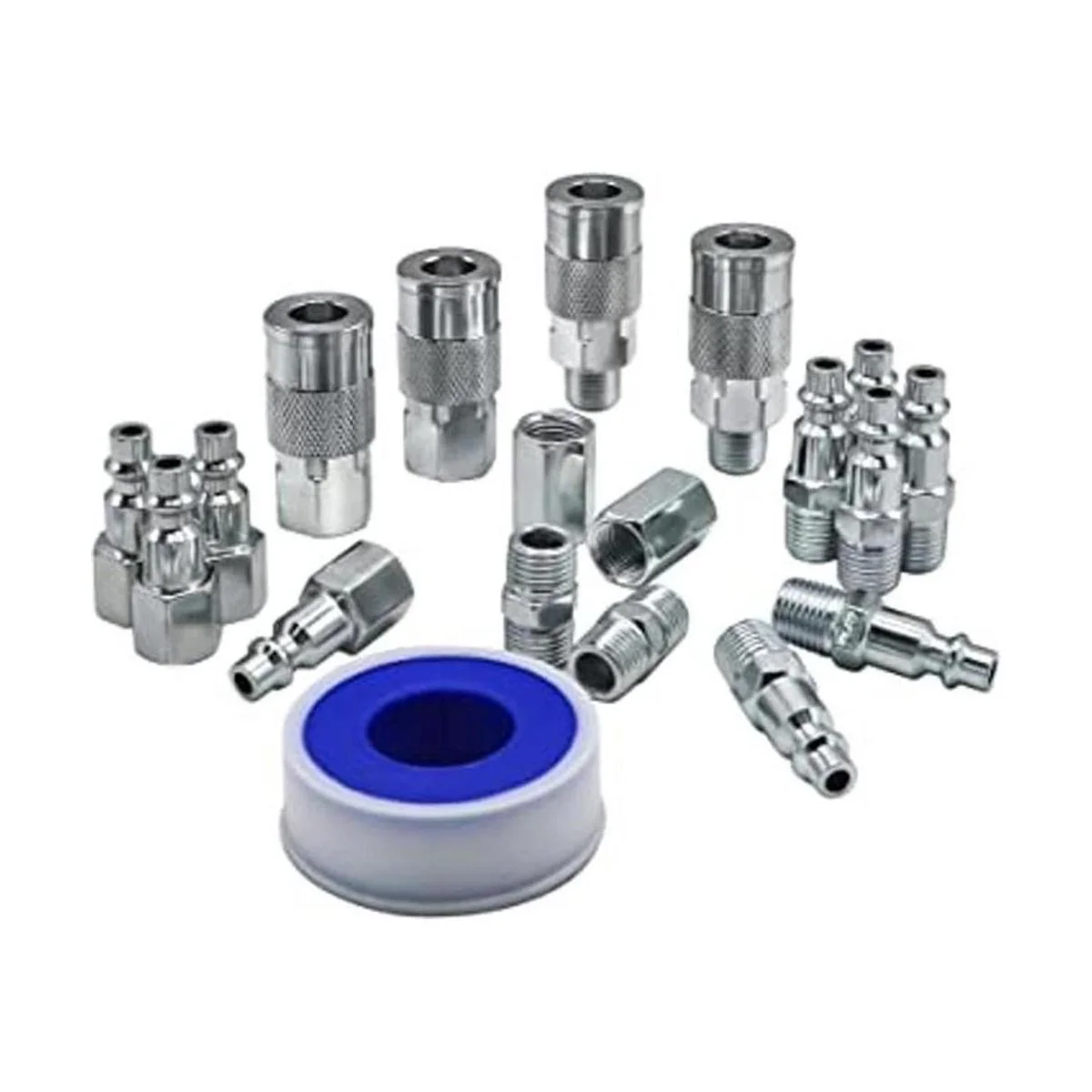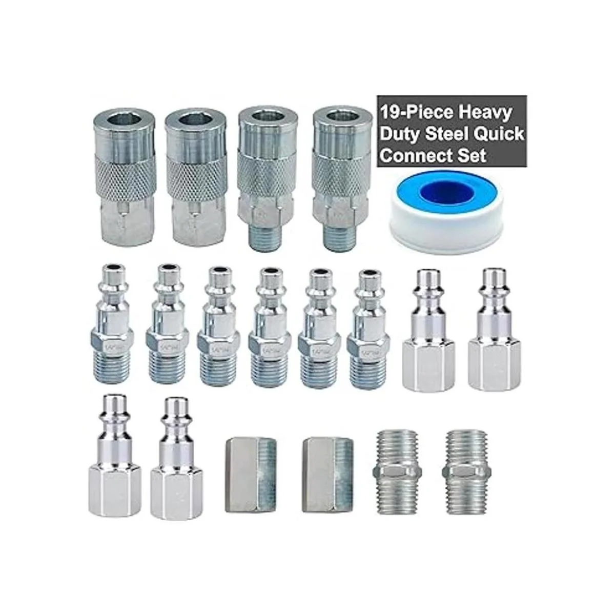 El kit de accesorios de aire de 19 piezas incluye: 6 conectores rápidos macho, 4 conectores rápidos hembra, 2 acopladores rápidos machos, 2 acopladores rápidos hembra, 2 acoplamientos macho de 1/4 x 1/4 pulgadas, 2 acoplamientos hembra de 1/4 x 1/4 pulgadas, 1 cinta de teflón. Todas las piezas están empaquetadas en una caja de plástico para un fácil almacenamiento.