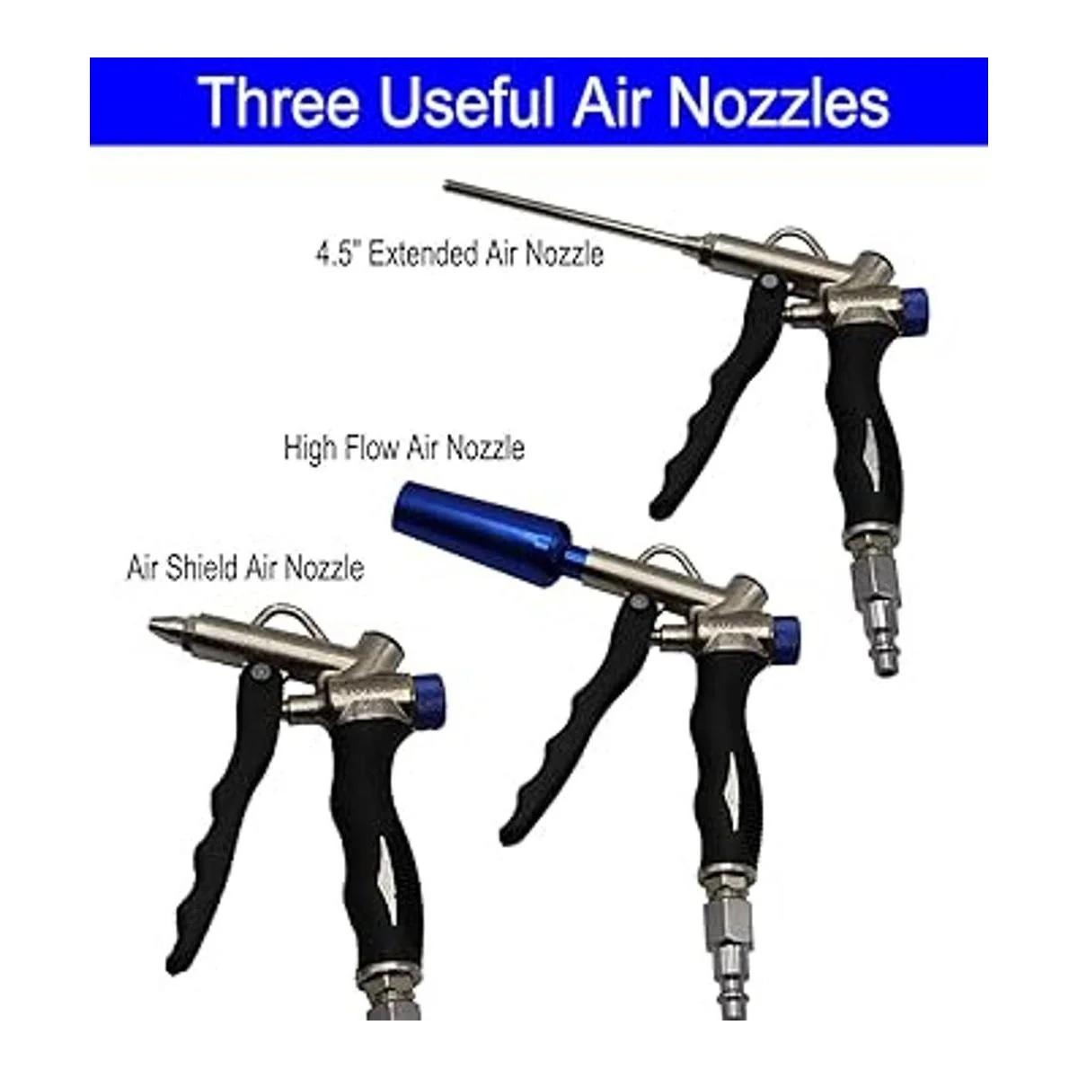 Incluye: boquilla extendida de 4.5 pulgadas, boquilla de alto flujo, boquilla de escudo de aire, conector rápido industrial de 1/4 pulgadas