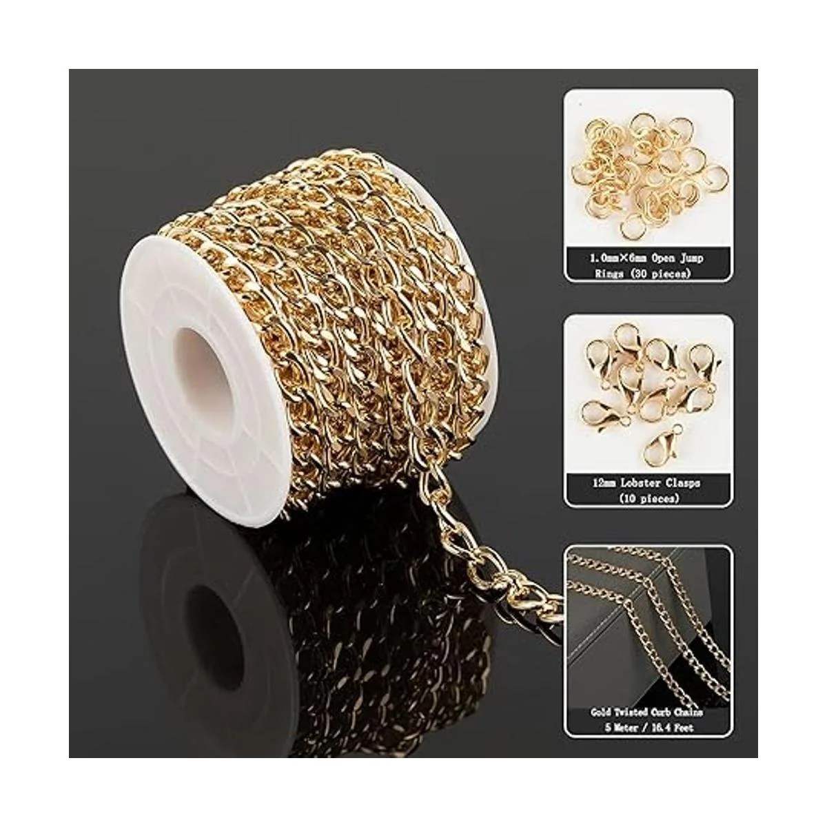 Lo que obtienes: el paquete incluye un rollo de cadenas de aluminio dorado sin soldadura de 16.4 ft, 10 cierres de mosquetón y 30 anillos de salto; con este kit de cadena de joyería puedes hacer muchos hermosos proyectos de manualidades y joyería.