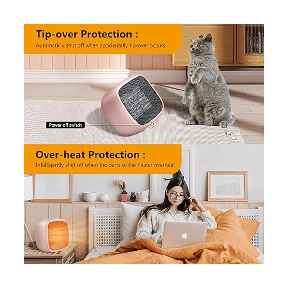 Seguro: el calentador de escritorio está hecho de material ignífugo, y hay un dispositivo elástico en la parte inferior, que se apagará automáticamente si se le vuelca. Ya no tendrás que preocuparte por el contacto accidental y los niños pueden tocarlo cuando utilices el calentador portátil, lo que es una buena característica de seguridad.