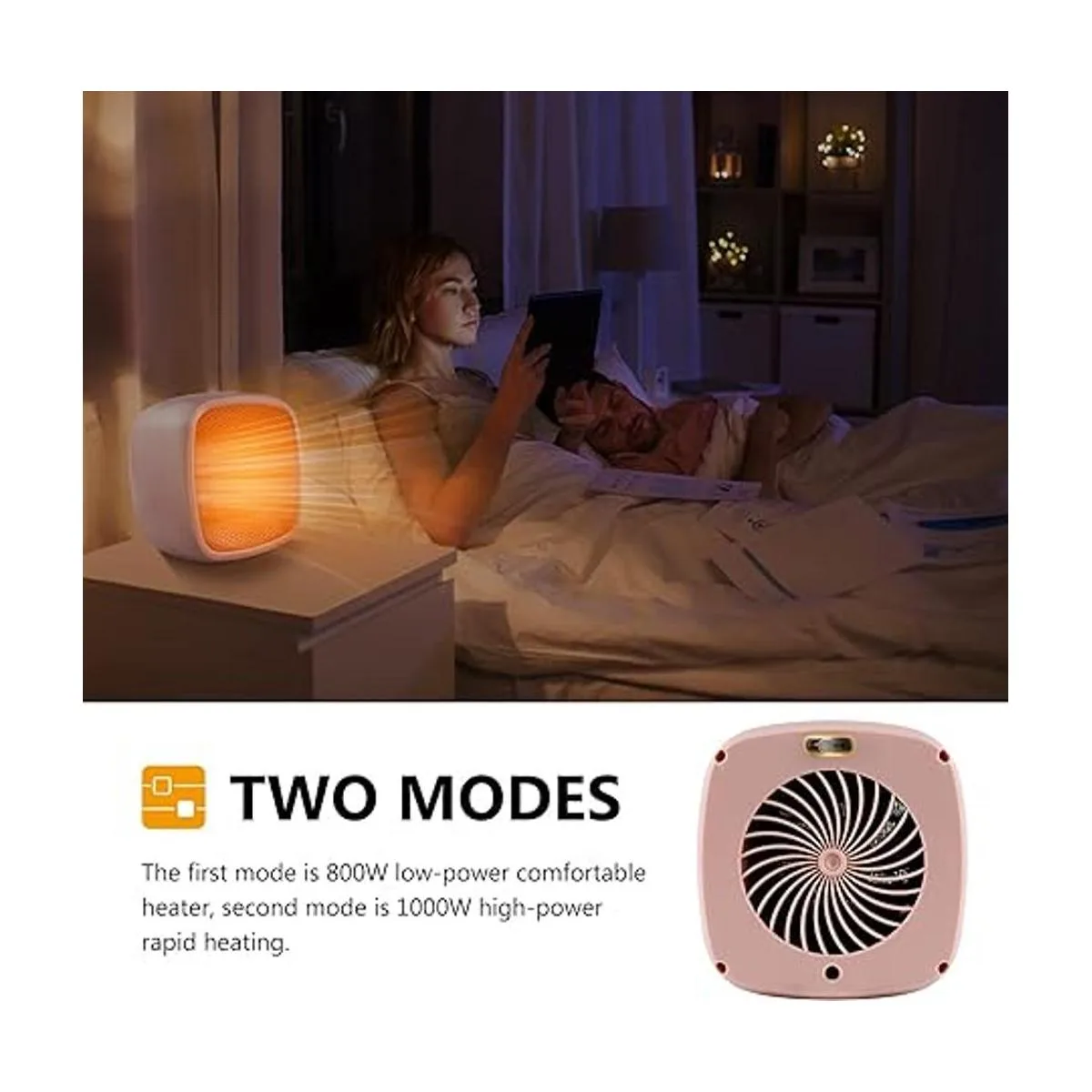2 modos para elegir: con 2 modos de calefacción, este calentador personal está diseñado para ofrecerte la máxima comodidad de cualquier manera que lo mires. El primer modo es un calentador cómodo de baja potencia de 800 W, el segundo modo es de calentamiento rápido de alta potencia de 1000 W.