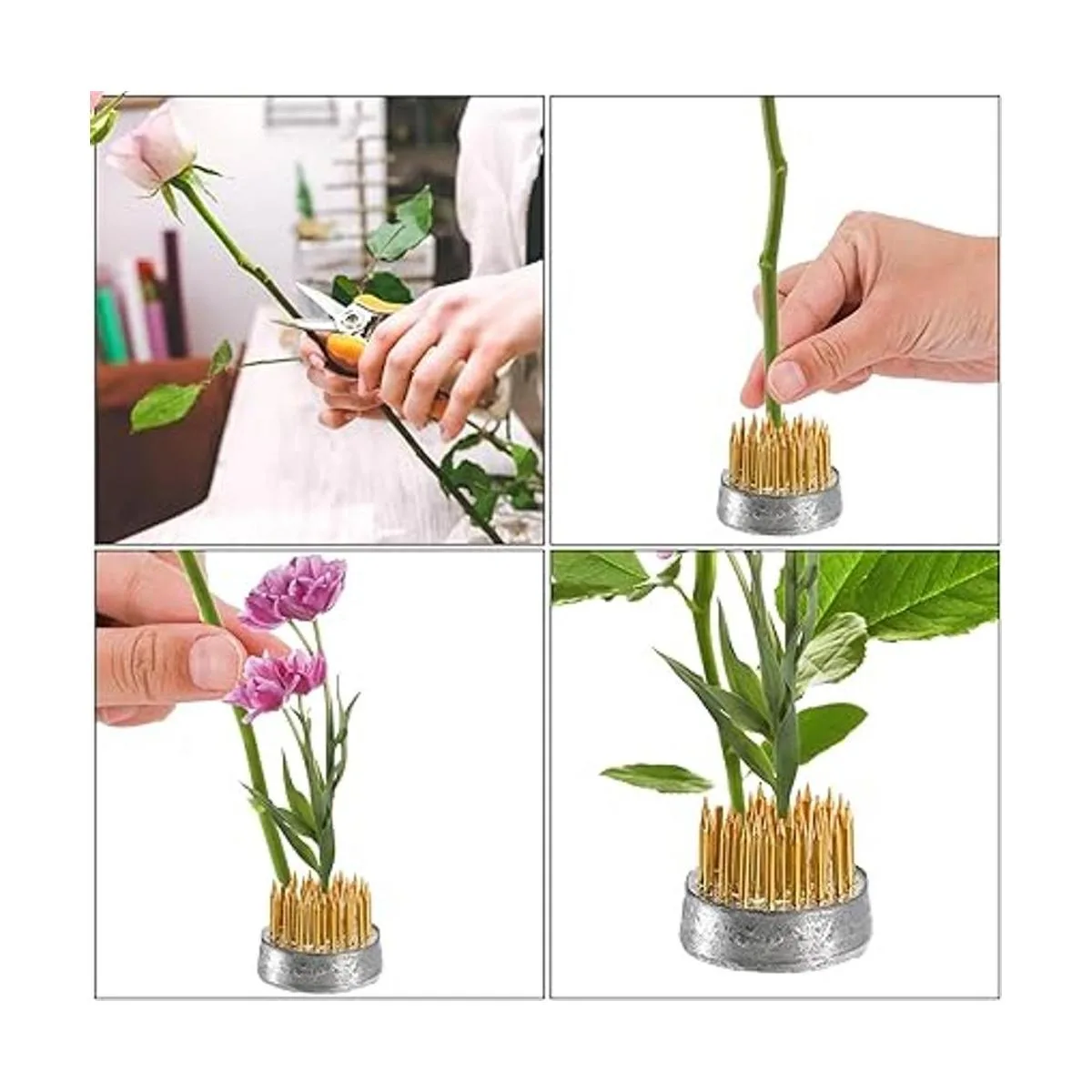 Agujas afiladas: las agujas unidas al soporte de flores están hechas de latón, lo suficientemente resistente como para mantener las diferentes flores y ramas en su lugar de forma segura. No hay necesidad de preocuparse por posibles caídas.