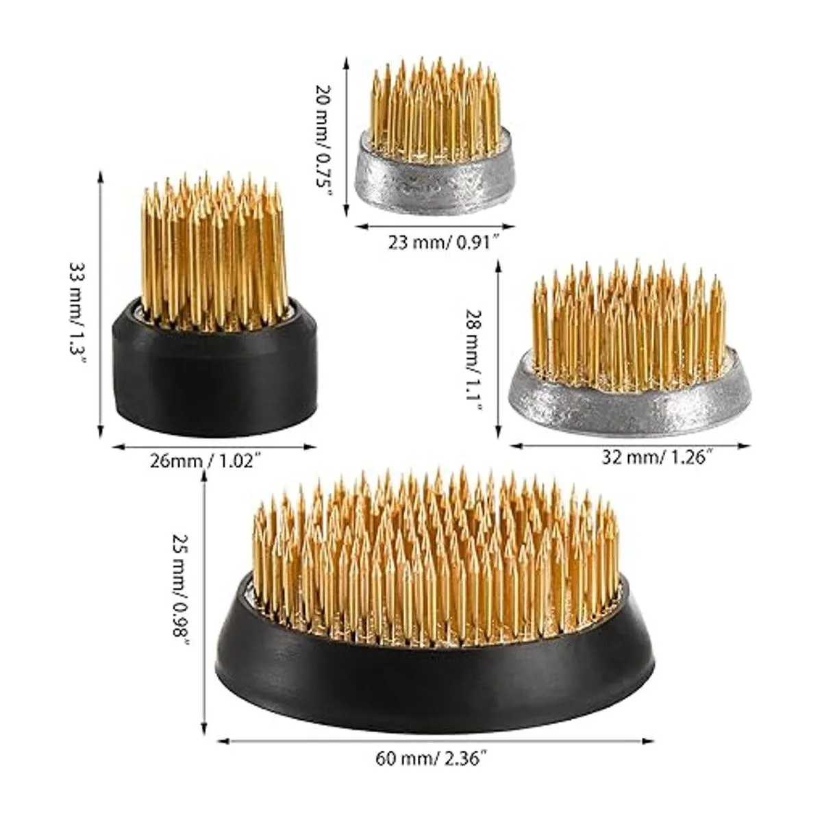YOUEON El paquete de 4 ranas de flores incluye 4 tamaños: 0.906 in, pesa aproximadamente 1.20 oz/1.2 onzas; el 1.024 in/ 1.02 pulgadas, pesa alrededor de 2.68 oz/ 2.68 onzas; el 1.260 in/ 1.26 pulgadas, pesa 1.83 oz/ 1.83 onzas; el 2.362 in/ 2.36 pulgadas, pesa 8.92 oz/ 8.9 onzas. Solo los pasadores de rana de 1.024 in y 2.362 in vienen con junta de goma.