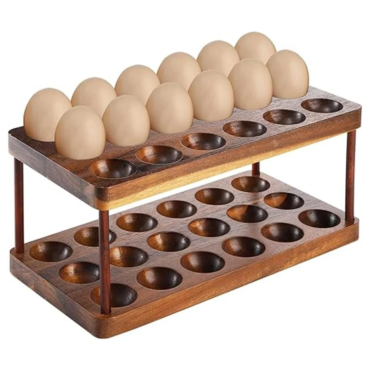 YOUEON Soporte para huevos de madera de acacia con doble capa, bandeja de huevos de madera con capacidad para 36 huevos frescos, bandeja de huevos diablados para almacenamiento de huevos frescos, organización de cocina, exhibición de encimera, almacenamiento en refrigerador