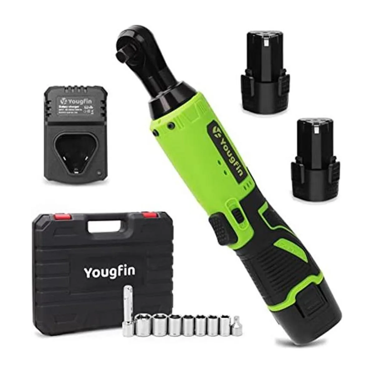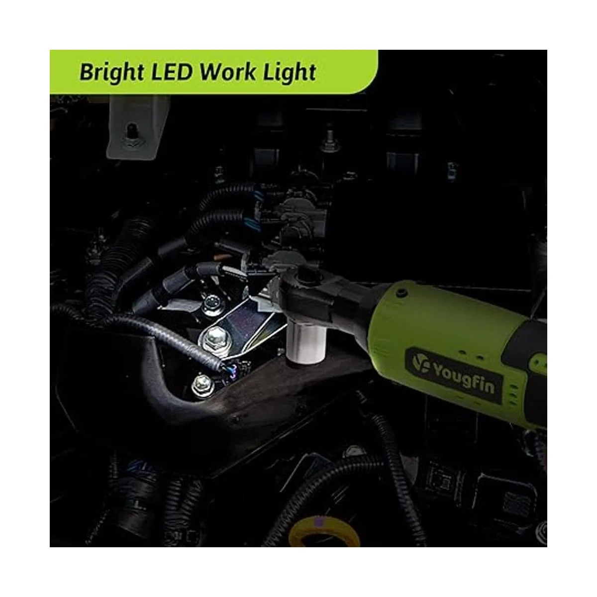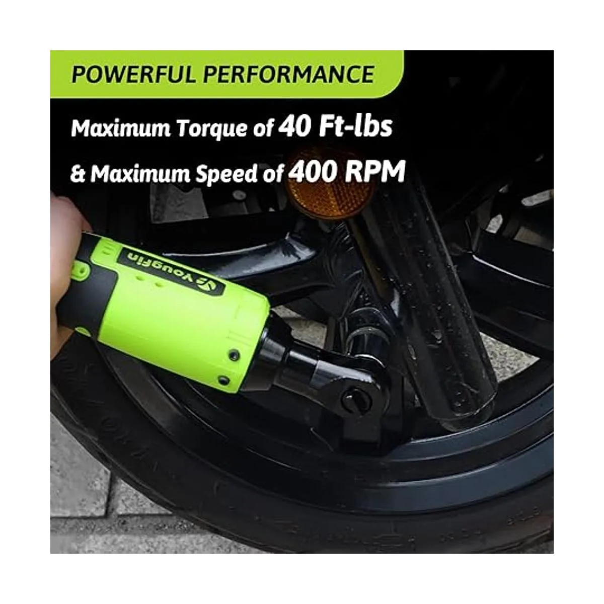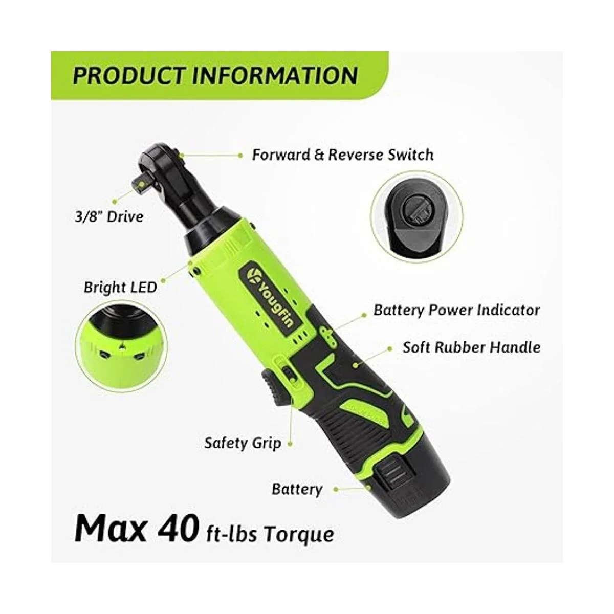 Yougfin Llave de trinquete, herramientas eléctricas inalámbricas de 12 V, luz LED, velocidad variable, alto par de torsión de 40 pieslibras 400 RPM, paquete de 2 baterías de iones de litio de 2000 mAh y cargador rápido de 60 minutos