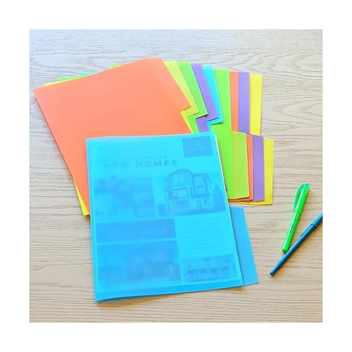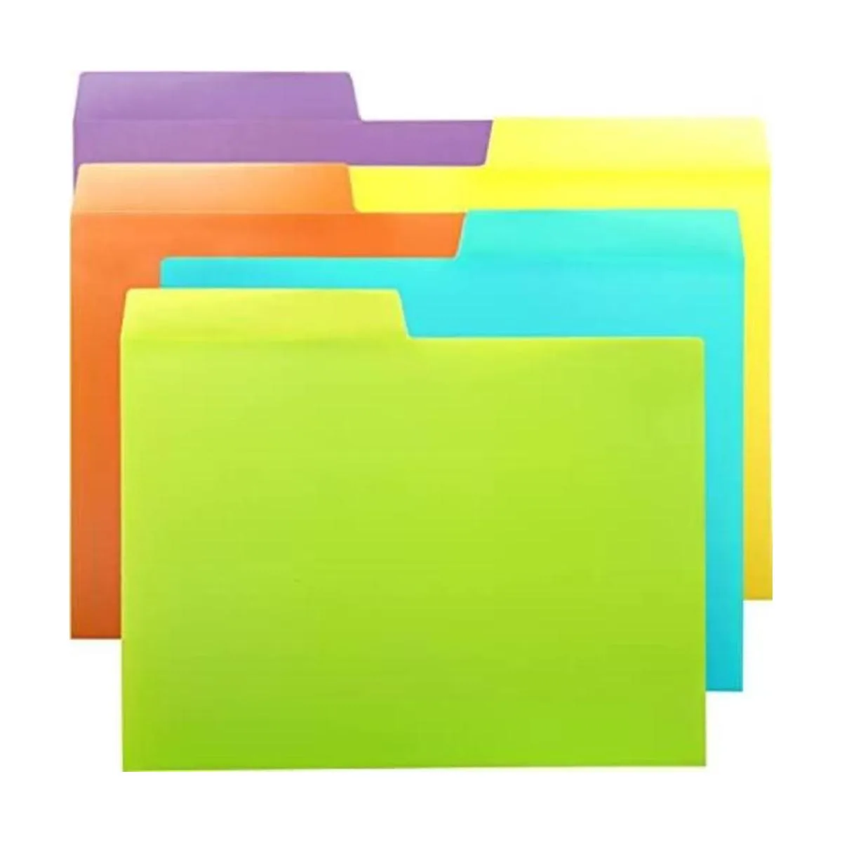 Carpetas con pestañas: en 5 colores vibrantes: rojo, amarillo, verde, azul, morado. Paquete de 2 unidades para cada color.