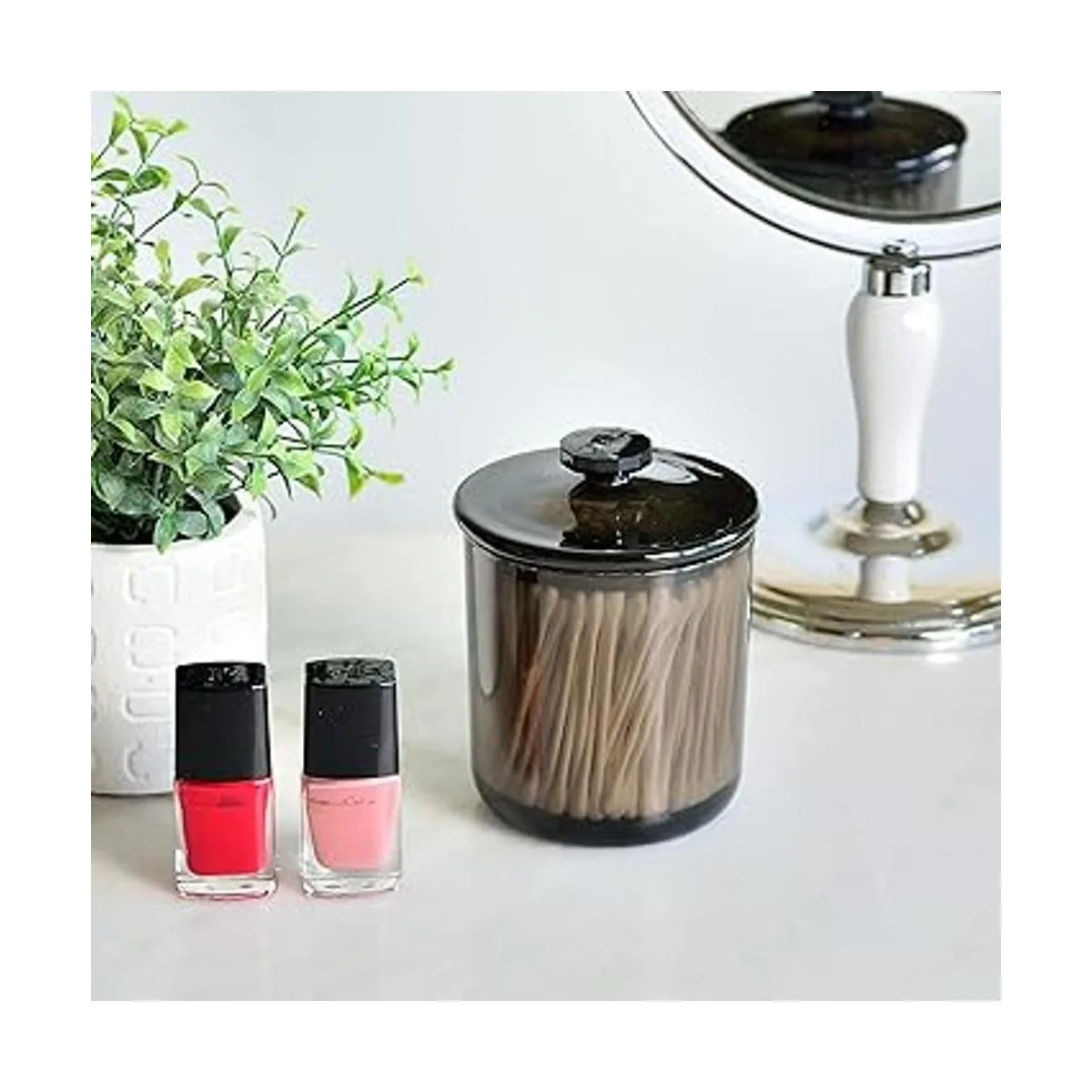 Youngever Paquete de 2 tarros de boticario de plástico negro de 15 onzas, soporte Qtip, soporte de hisopo de algodón, organizador de tocador de baño para bolas de algodón, almohadillas de algodón, Qtips