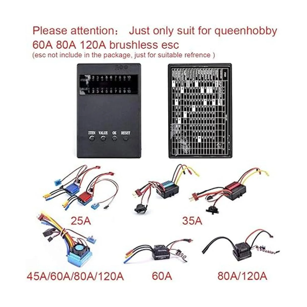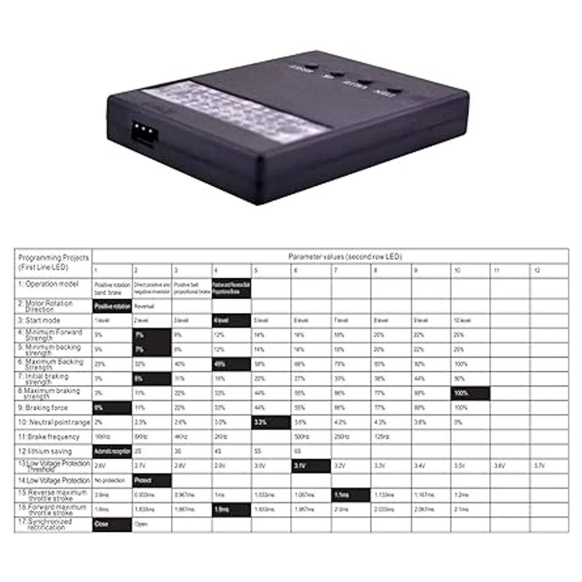 Uso para: la tarjeta de programa se utiliza para programar el ESC sin escobillas para 25A, 35A, 45A, 60A, 80A, 120A ESC. Máx. Fuerza de freno: 50, 25, 75, 100 25A, 35A, 45A, 60A. 25, 50, 75, 100 80A, 120A. Máx. Fuerza inversa: 25, 50, 75, 100. Rango neutro: 9, 6, 12 estado de trabajo