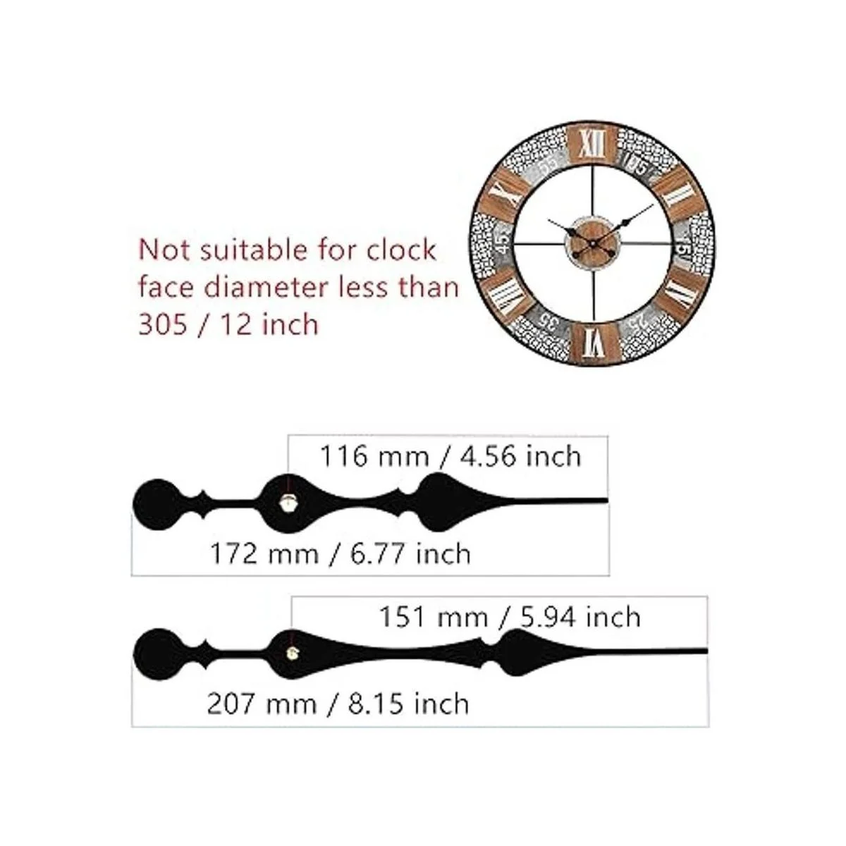 Medición: Longitud total de la manecilla de la hora: aprox. 6.772 in. Longitud total de la manecilla de los minutos: aprox. 8.150 in 8.1 pulgadas; Segundas tapas: aprox. 0.276 in.