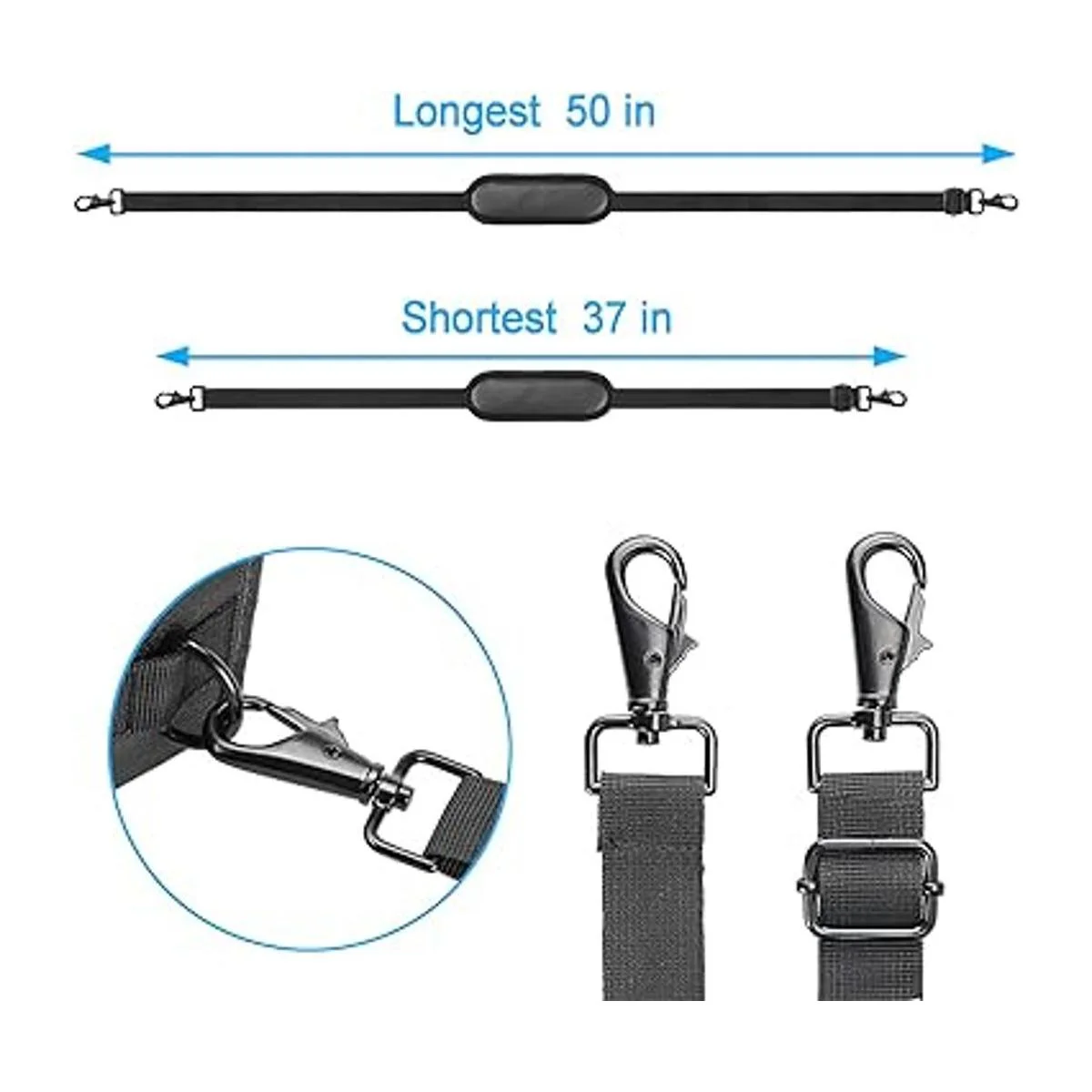 The padded shoulder strap can be adjusted length from 37 inch to 50 inch 95cm to 129cm, 2.5 inch in width. The easy adjustment in length allows for the perfect fit.
