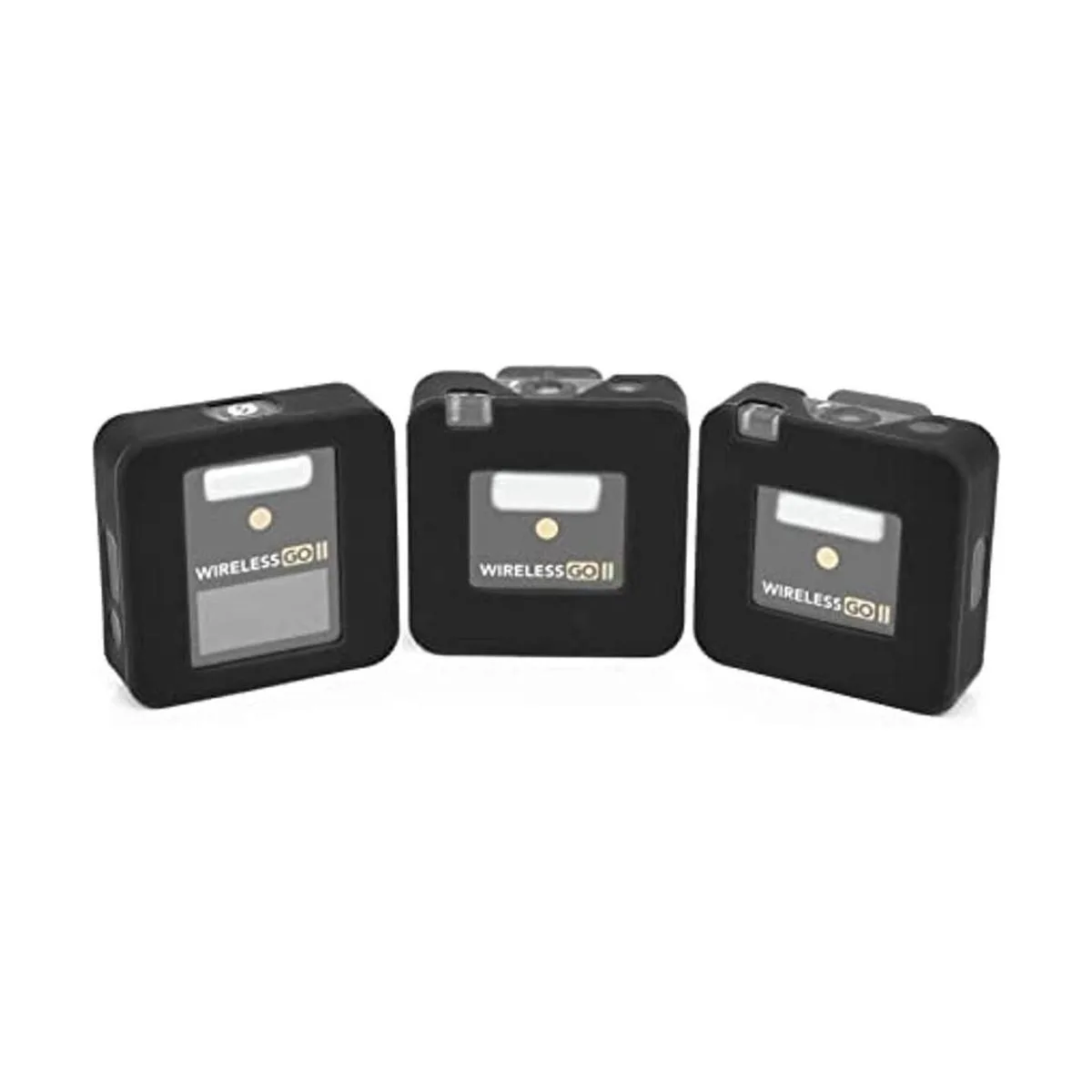 El paquete incluye: 3 fundas de silicona, aplicadas a un receptor, dos transmisores. Rode Wireless Go II no incluido