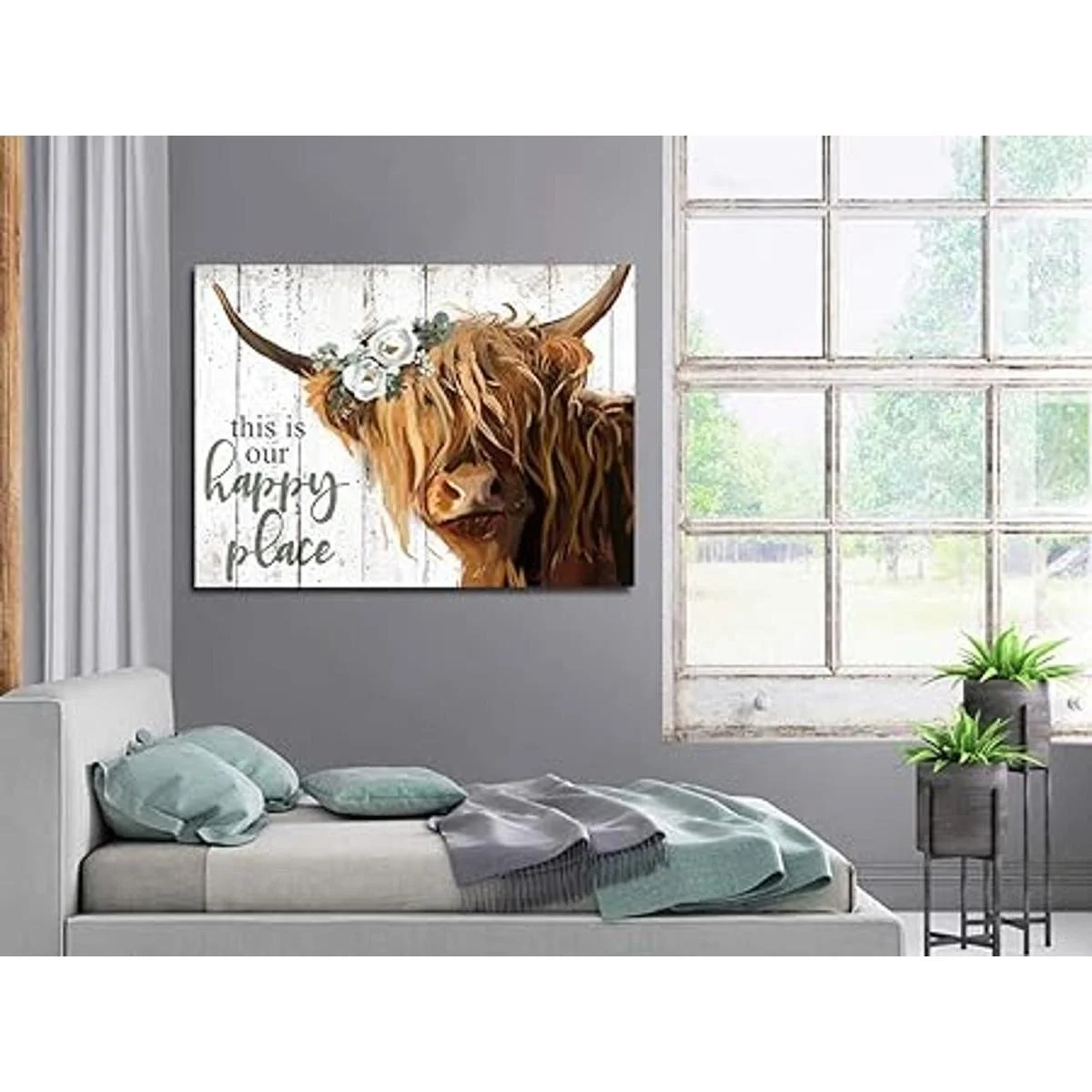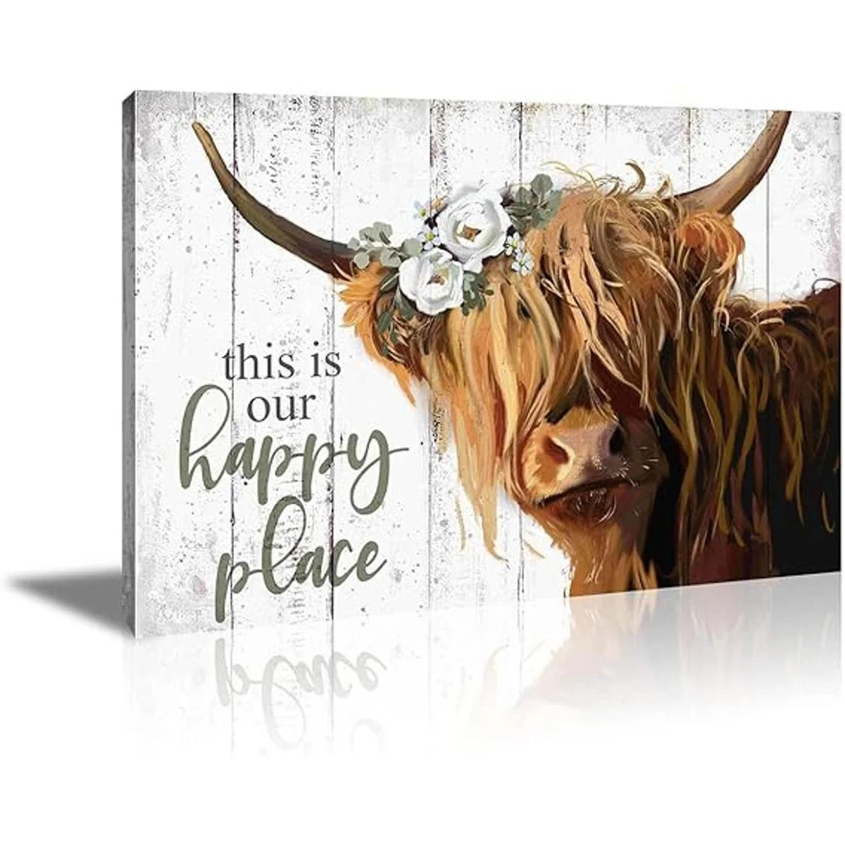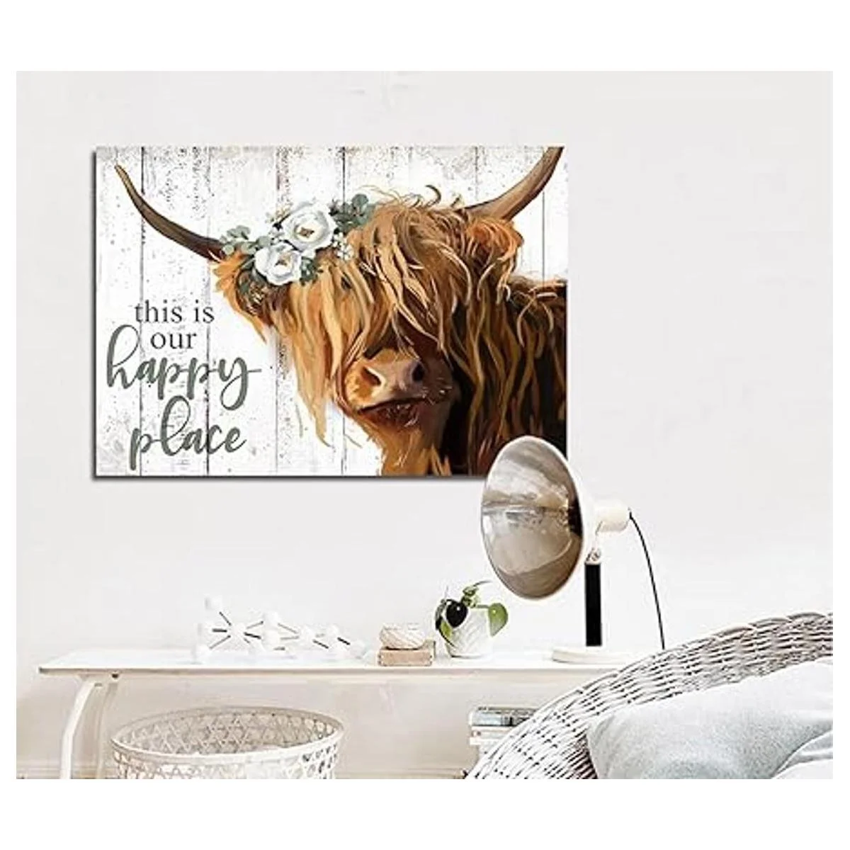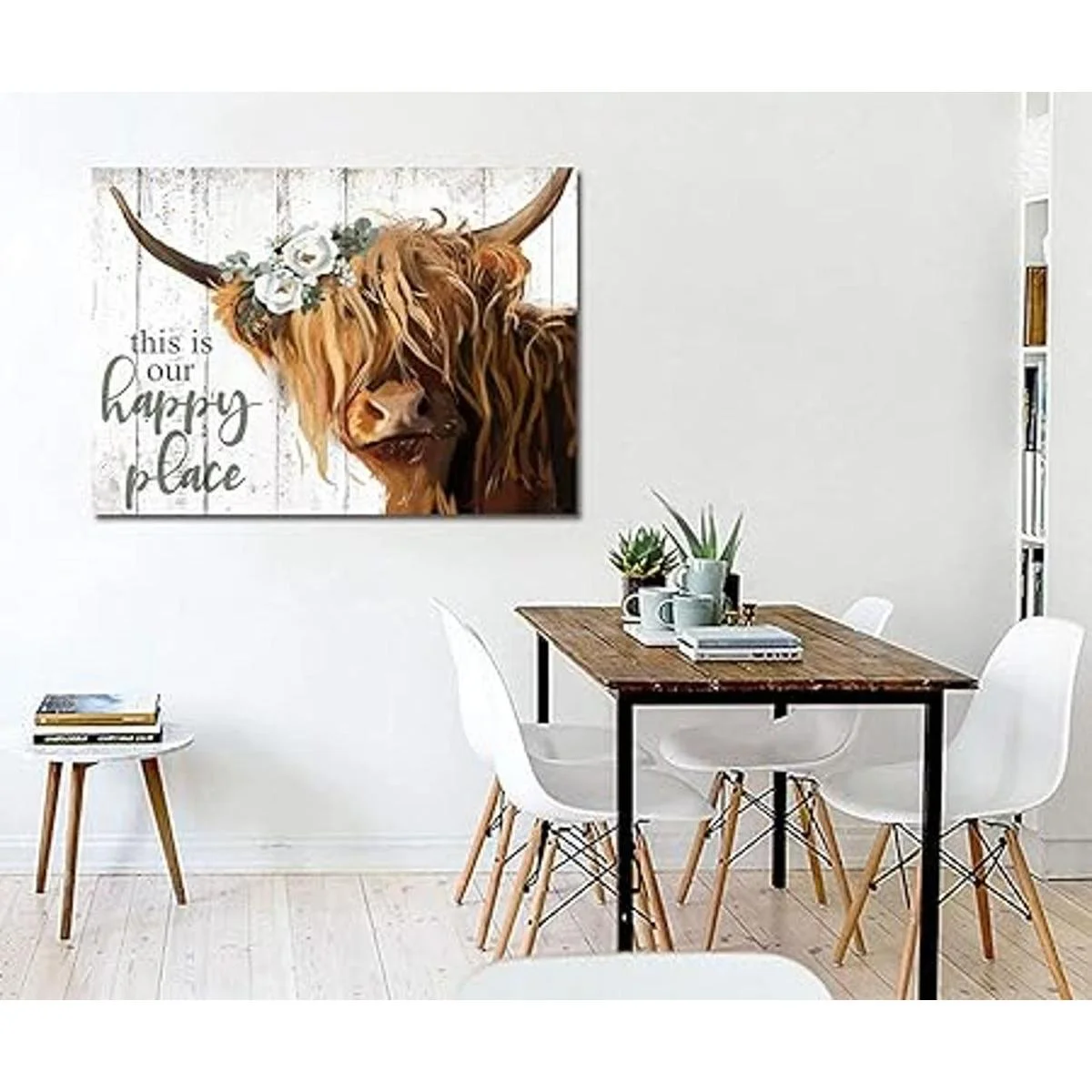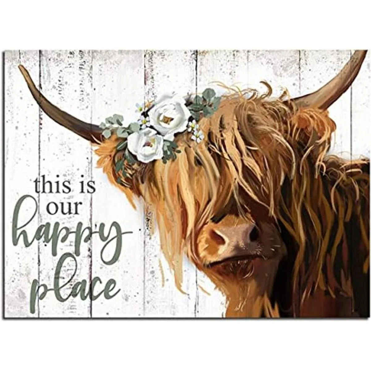 YPY Arte de pared de vaca de las tierras altas This is Our Happy Place Póster de lienzo inspirador para el hogar Vaca escocesa de pelo largo con imagen de flores blancas Decoración de cocina de granja enmarcado 24 x 36 pulgadas
