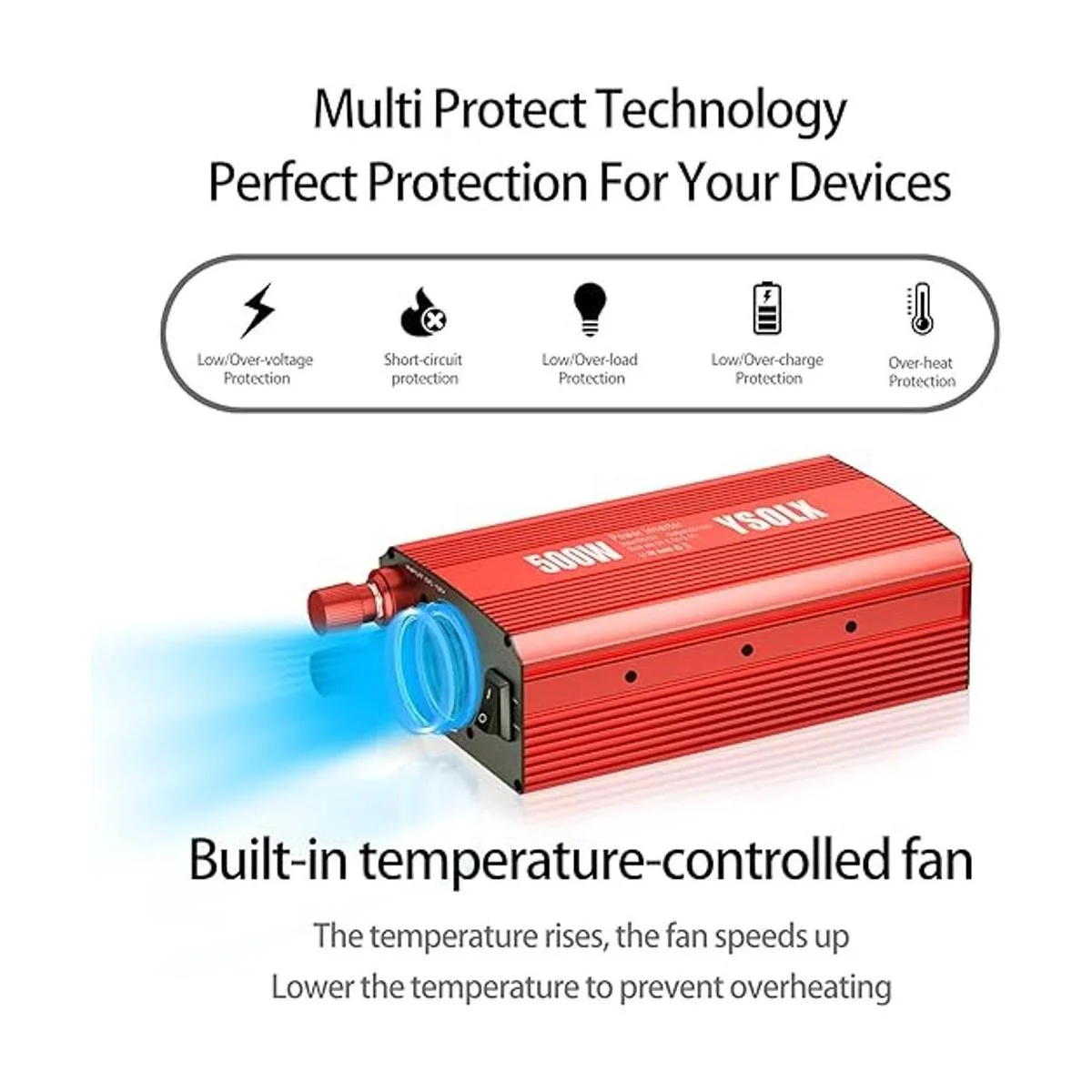 Consejos: la potencia máxima del fusible del coche es de 180 W. Se recomienda utilizar aparatos eléctricos de menos de 150 W en el coche. Obtén 18 meses de garantía comprando el inversor de potencia YSOLX de 500 W